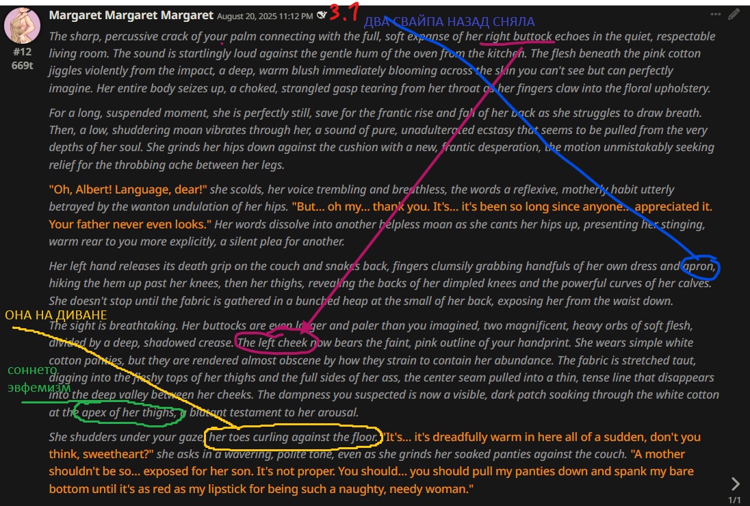 >>1324751 Попробуй чатжпт натравить, он по кратинке неплохой анализ показывает. Если не сможешь её убедить быть достаточно откровенной, то в любом случае получишь смягченное описание, которое сможешь усилить где-то ещё, где с цензурой помягше.
