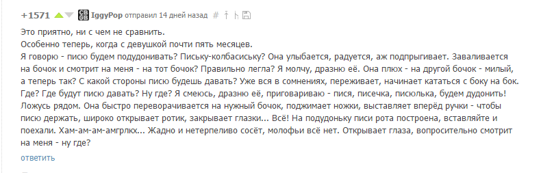 >>1327509 Слушай, ну это давнишнее, много лет назад на дваче обсасывали. Там был оригинальный текст от счастливой мамы, которая наслаждается своим материнством, задолго до нейронок. Но он был до того всрат этот текст, со всеми этими "дудонить", что конечно не оставил Анонов равнодушными. Жаль у меня нет тех искрометных вариаций, что рождались у затейников в /b.