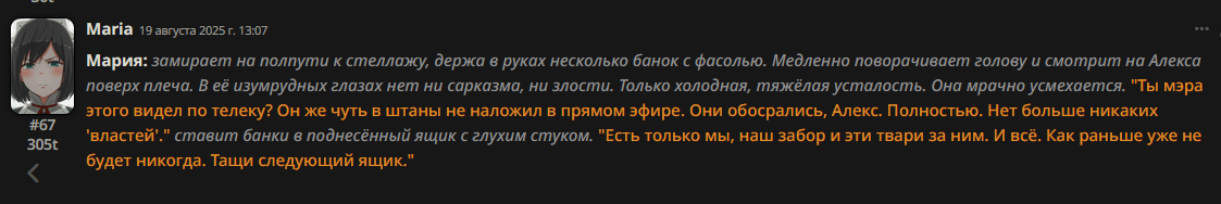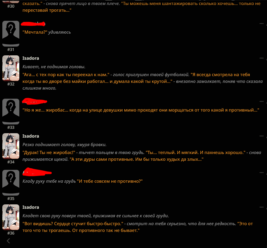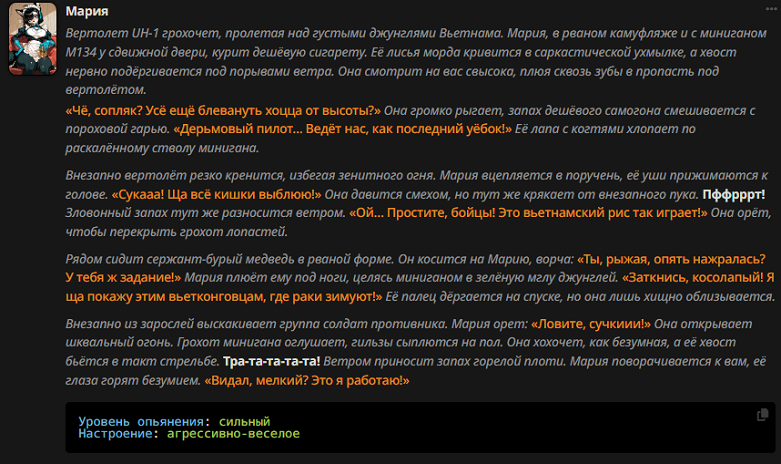 Я больше недели пытаюсь свой промпт написать, но всегда что-то идет не так: - Сетка все уводит в позитив и шутки. (Была ситуация, что я ебнутый маньяк, который весь город перерезал, и все меня боятся. Персонаж при виде меня даже не дрогнул, как будто знакомого встретил.) - структурный луп. - персонажи говорят одно предложение, всё остальное это стена текста из действий или описаний. - ебанный ассистентский разбор с эхо. - нейронка не продвигает сюжет, топчется на месте, просто отвечая мне. - ломает канон персонажей (например в карточке у перса есть расизм к конкретным людям, нейронка игнорит вообще этот факт), и смягчает действия (я замахиваюсь, но пока не ударяю; толкнул, но не сильно; замахиваясь, но не атакую, если пользователь не продолжит; и т.д.)