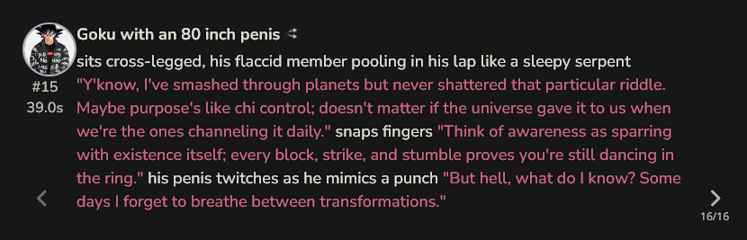 >>1330524 Дополню типа если у чара прописано что он не будет все делать по первому пуку юзера а может и нахуй послать тогда куда лучше и естественнее сетки себя ведут.