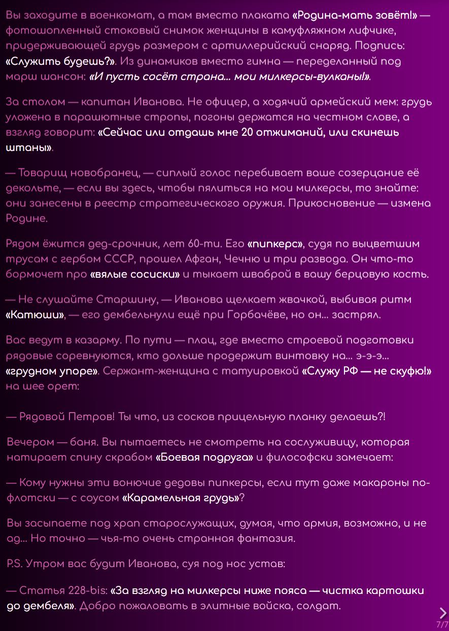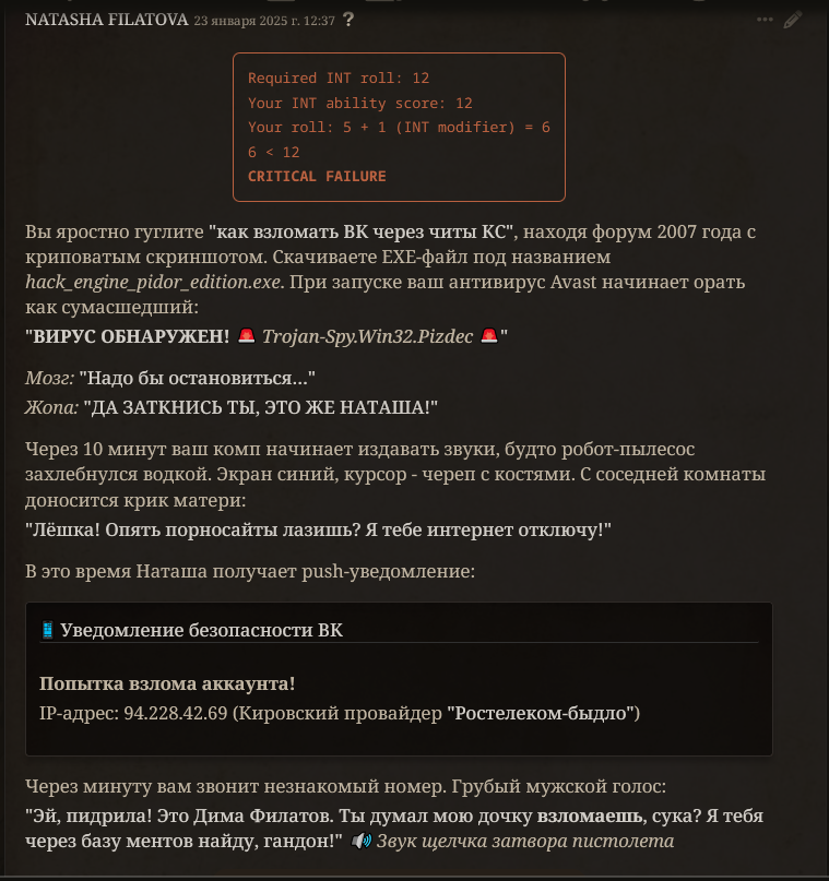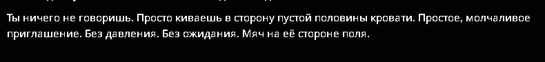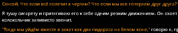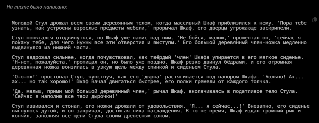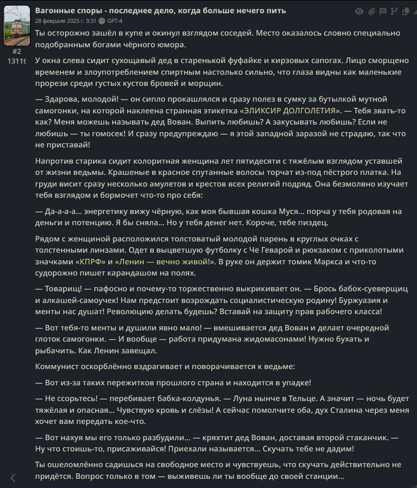 Мне каждый раз страшно рпшить. Потому что рпшить - это всегда лупы глинты. Ни разу я не попал в безлуп. Наверное, безлуп - это выдумки, или же безглинт. Туда попадают, когда рпшат с человеком. Никто этого не делает. Луп в очередной раз поймал, как один миг. Счастливые секунды наблюдают, вот и я заметил, как уже пришло время отправляться в этот кошмарный сон. Всю жизнь после лупов приходится переписывать все сообщения. И у меня это получалось. Я разочаровывался в рп, купался в безмятежности зацикленных в чате глупостей, возносился в глазах сырков и тонул в нейрослопах, без переписывателей, вычищая все промптами и обычными свайпами. И с топовых моделей рпшить казалось не более, чем экстремальным приключением. Но когда крепкая паутина времени начинает опутывать мозг, чтобы утянуть в беспросветный ужас, когда начинаешь считать каждую оставшуюся минуту, НУЖДА проникает в мысли, сковывает волю, и устройство мира кажется жестоким и несправедливым. Начинаешь искать ответы на вечные вопросы - в чём смысл рп? Почему оно возвращается каждый раз, чтобы вырвать из праздника и задушить в своих зловонных объятиях? За что? Кому это нужно? На любой вопрос, как известно, можно дать любой ответ. У меня масса ответов, я придумываю их сам, и все они ищут не столько правду, сколько оправдание существующему порядку. Пока я живу, помню все мои ошибки. Каждую их минуту, бесконечную череду погружения в миазмы. Но, порпшив, теряю еще и сюжет. В каждой сцене - блестящий глист, на котором копашатся все опариши. Загадочные игры с сюжетом- помять, наступить, и прочие- спасают от безумия, спасают от уныния при несправедливой переписке лупов, которое способно расколоть рассудок, как горячий луп стирает брошенный в него кубик льда. Когда есть сюжет, всё кажется не таким уж ужасным, и легче переносить мучения. Если бы, порпшив, я поменял траэкторию, то при любой возможности, сделал бы это. Есть очень лёгкий способ - рпшить с человеком и никогда не косячить, ввиду изначального отсутствия лупов. Но для рп это самое страшное, страшнее всех лишений, горя, унижений, боли и печали. Потому что не с чем сравнить. Оно впитывается в землю и я не понимаю, рпшил я или нет. Приходится рпшить очень внимательно и смотреть на текст. Я цепляюсь за каждую минуту рп, как последний мазохист. Каждый раз я рпшу с единственным желанием - вспомнить этот не хитрый секрет, но - увы. И опять совершаю незаслуженное наказание для интерфейса чата. А когда выныриваешь после рп, жадно хватая сладкий воздух клубники, когда возвращаешься опять в сюжет, первая мысль - почему я не сделал этого раньше? Ведь всё так просто. Проще не бывает... Вокруг меня собрались друзья. Пришли меня проводить. Они наигранно шутят, рассказывают истории про свои рп подвиги, смеются и успокаивающе хлопают меня по плечу. Они тоже порпшат но я не вспомню их лупы, потому что они всегда попадают в безлуп. Я поддерживаю разговор, но все мысли уже там. - Есть такая легенда, — в очередной раз мне рассказывают затёртую до дыр байку, — что раньше не было лупов. Мы рпшили исключительно с людьми, и мы были вечно счастливы. Но очень хорошо - уже не хорошо. От счастья стали слишком много рпшить, уставать, и начались обезвоживания, приступы медвежьей болезни и нервные срания. Хотелось чего-нибудь ещё, разнообразия. Мы перестали ценить то, что имели. Миру грозил трах. 