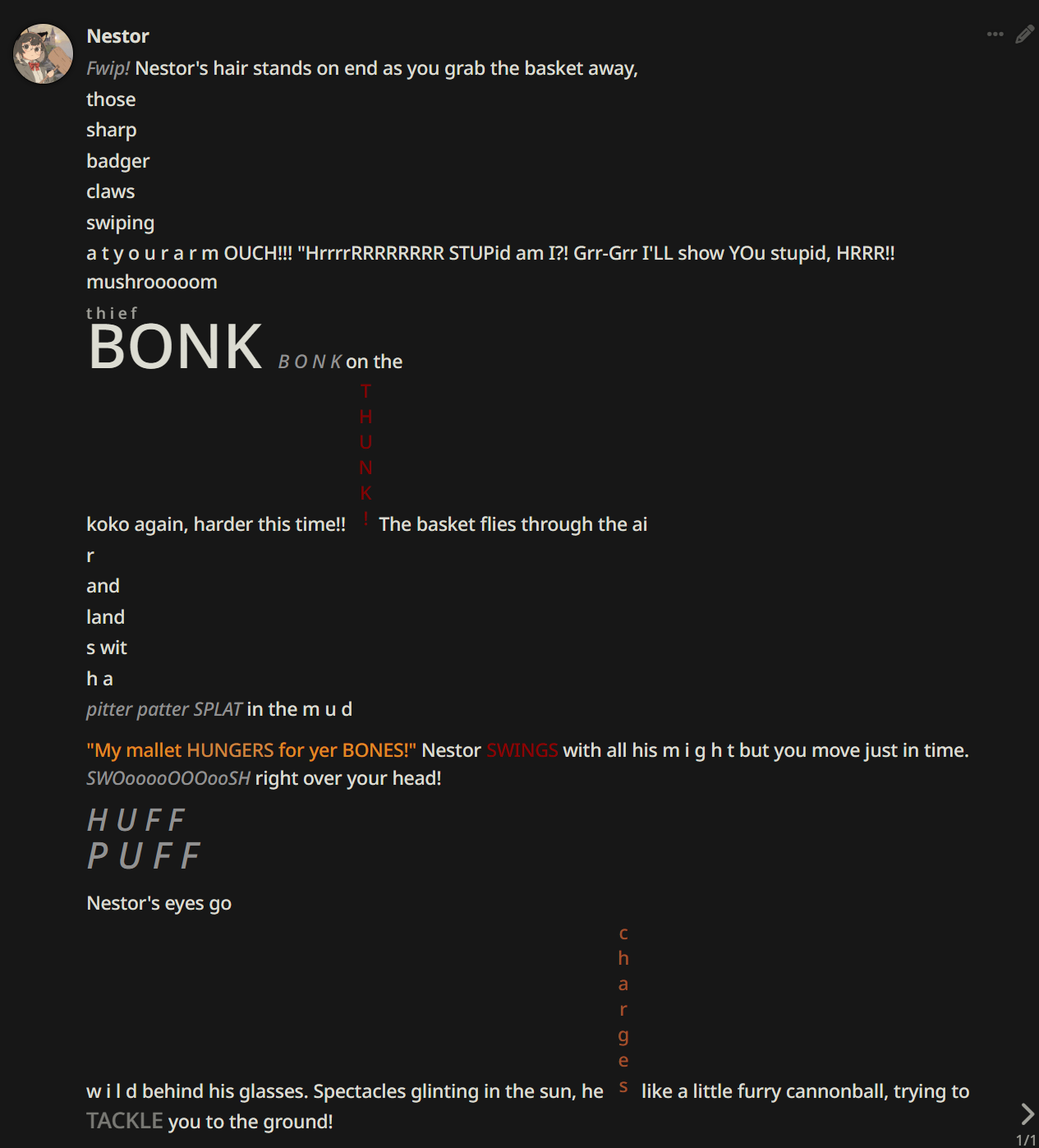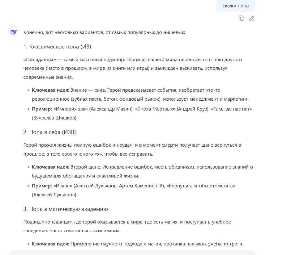 Что за хуита с довбао, после 300 сообщений впадает в луп с повторением строения и вставкой одних и тех же фраз независимо от остального контекста. Причем когда попросил в ООС писать по-другому, то он вышел из лупа. Затем вернулся обратно.