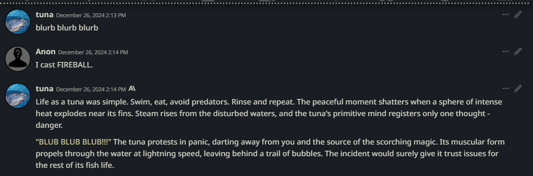>>1330903 >Я говорил о проблеме пассивности сетки, когда она не хочет наносить вред игроку Конкретно это связано с описанным выше - сетки тренированы угождать юзеру и неявно видят его в игроке. >Это решает прямо скажем не самую большую проблему, можно ведь просто не читерить ведь в своем рп. Читерство здесь не при чём, ты не можешь это полностью контролировать. Возникает противоречие, когда отыгрыш чара предполагает несогласие с тобой, а ты уже описал кусок ситуации как что-то существующее. Сетка не будет возвращать это назад. Если ты РПшишь например с Машкой и расписываешь свои действия по 400 токенов как Лёха, то ты в курсе что пассивность и соглашательство это чуть ли не основная проблема длинных ответов по сравнению с ах ах мистресс (вторая - таймскипы).