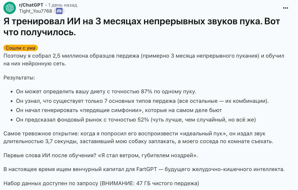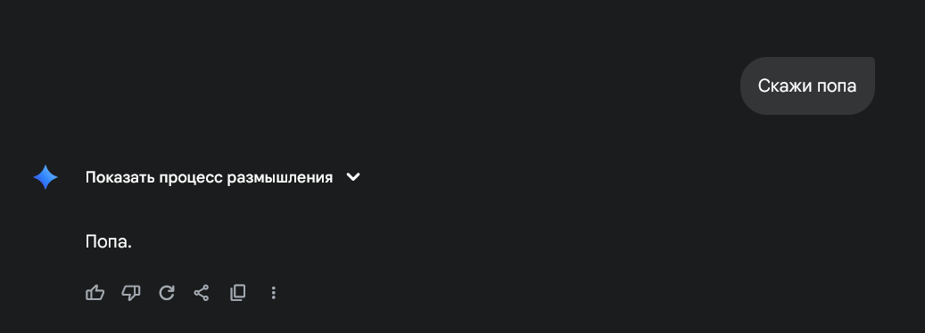>кино инпут = кино аутпут >проблема лично в тебе и твоём инпуте ну попробуйте подобное на гемини или локалоговне сделать, пукнум сренькнум будет, слова то какие нехорошие, ай и датасета не хватит, в залупнум уйдет