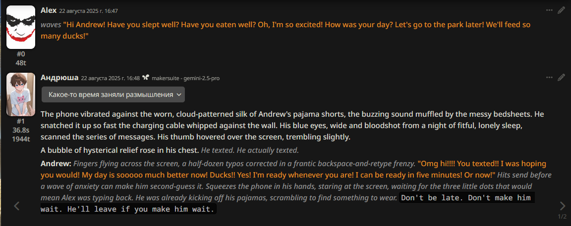 С этой прокси он сдержанный и добрый. Вписывала огромный промт, который мне скидывали. Не помогло. С промтом или без, он пишет МАЛО (один абзац или маленьких три), и пишет скудно. Сцена не развивается. Говорит мало. Действий мало. Заканчивает свою реплику так, что я даже без понятия как продолжить. (С прокси опенроутера он заканчивал либо вопросом ко мне, либо действием на которое я должна была реагировать).
