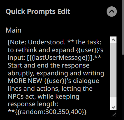 >>1328279 Не всекаю как он должен работать. Если это делается вручную, то нах он нужен? А если автоматически через регекс, то хз - наверное можно сделать через xml, но это куча ебли и новых инструкций в промпте. Почему б не добавить в таверну функцию отдельного api для саммарайз нейронки.