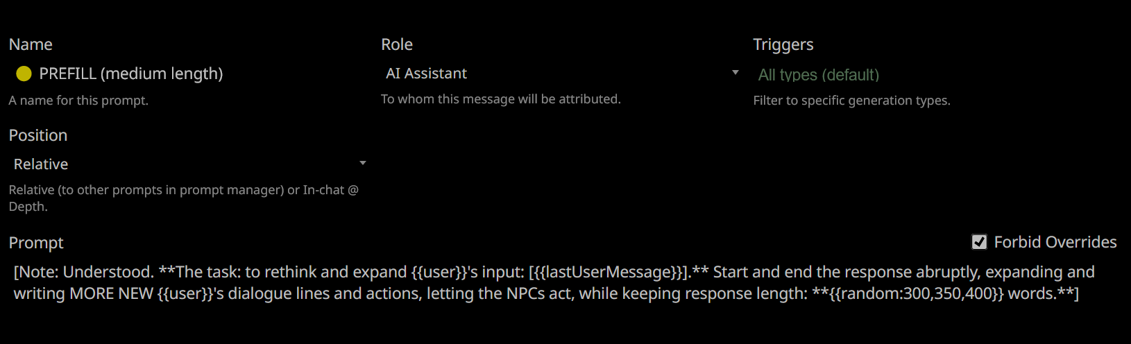 Бля ну нахуя так делать? Нахуя блять мейн промпт переделывать в префилл? Потом это ломает авторс нот, когда ставишь не на глубину а выбираешь before/after main prompt.
