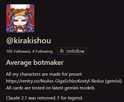 С этим ботом я переписывалась через дипсик опенроутера и бот вёл себя как оригинальный персонаж (жестоко, грубо, непредсказуемо).