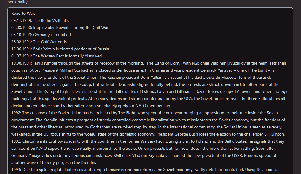 >>1328487 Может это и прикольно поначалу, но ты уже и сам видишь что РП со сгенеренным на лету персом плохо работает дальше нескольких сообщений. Это проблема и карт-симуляторов, где прописан только сеттинг без персов. Если у тебя персы не мимолётные, нужно продумывать описание и оставлять его на одном месте.