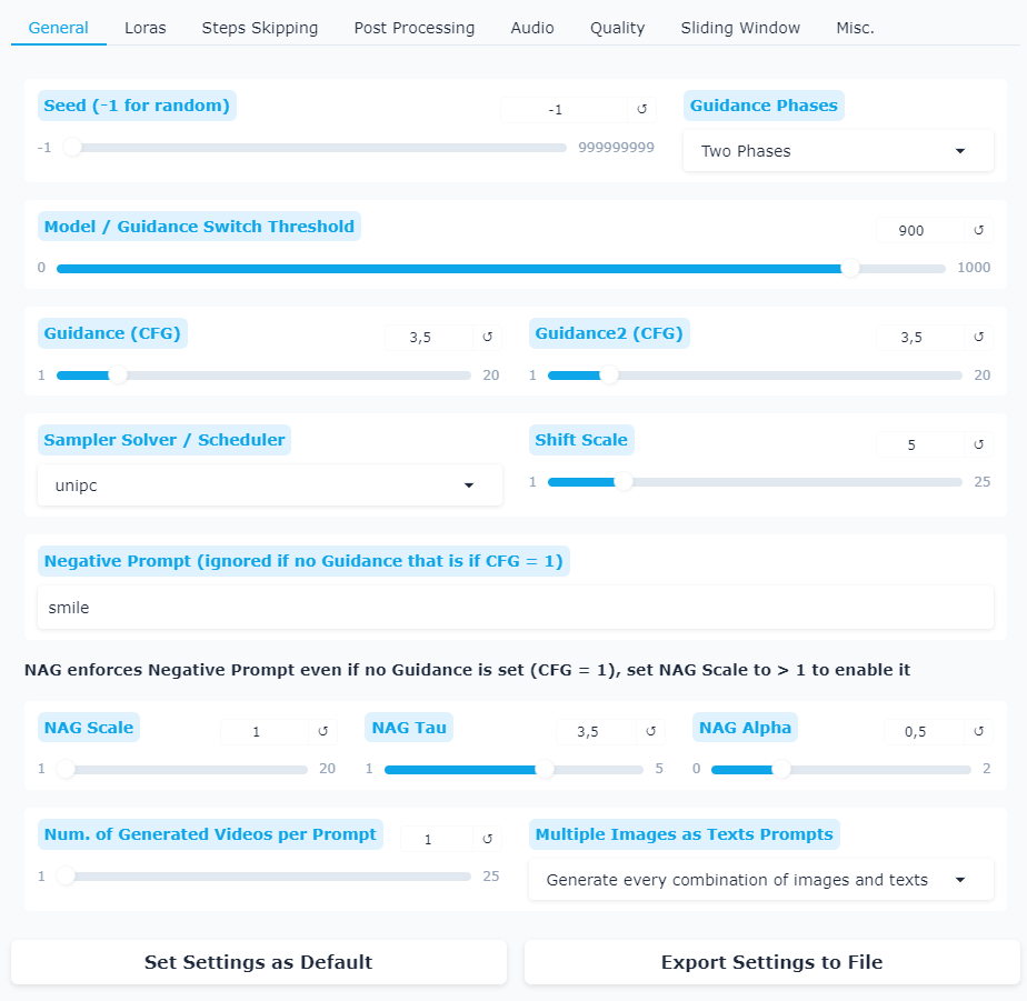 >>1344907 Во первых открой воркфлоу ван 2.2 из темплейтов, там кейсемплер адвэнст или расширенный будет и их 2, по одному на модель лоу и хай. Там 4 шага на каждый и лору загугли лайтнинг на 4 шага, ее грузишь лоралоадером, она дает возможность генерить видео за меньшее количесво шагов