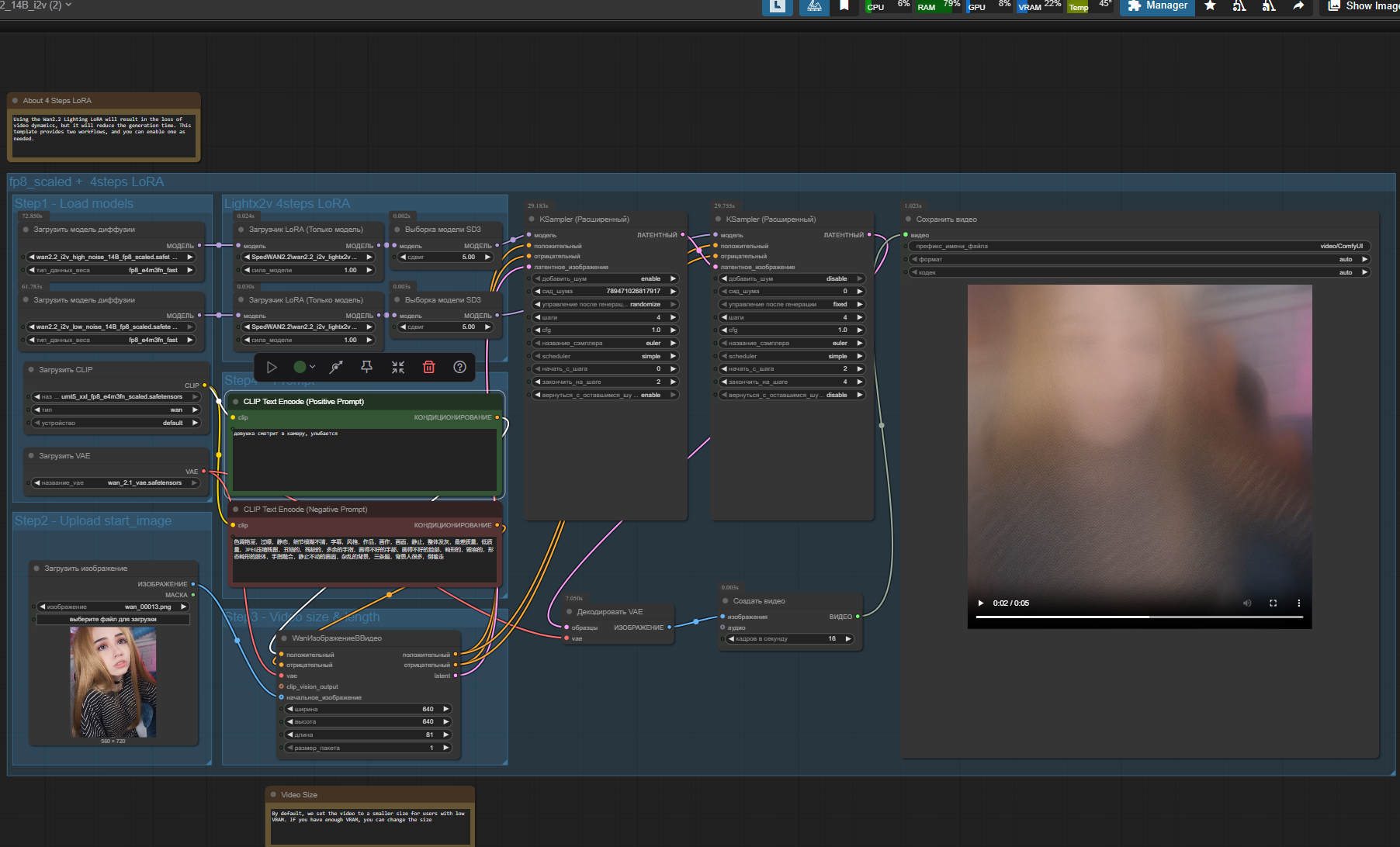 Бля почему в итоговом получается такая хуета? Если перевести на ван 2.1 то генерится всё как полагается. С ван 2.2 вокрфлоу конечный результат вообще не похож на оригинальный кадр.
