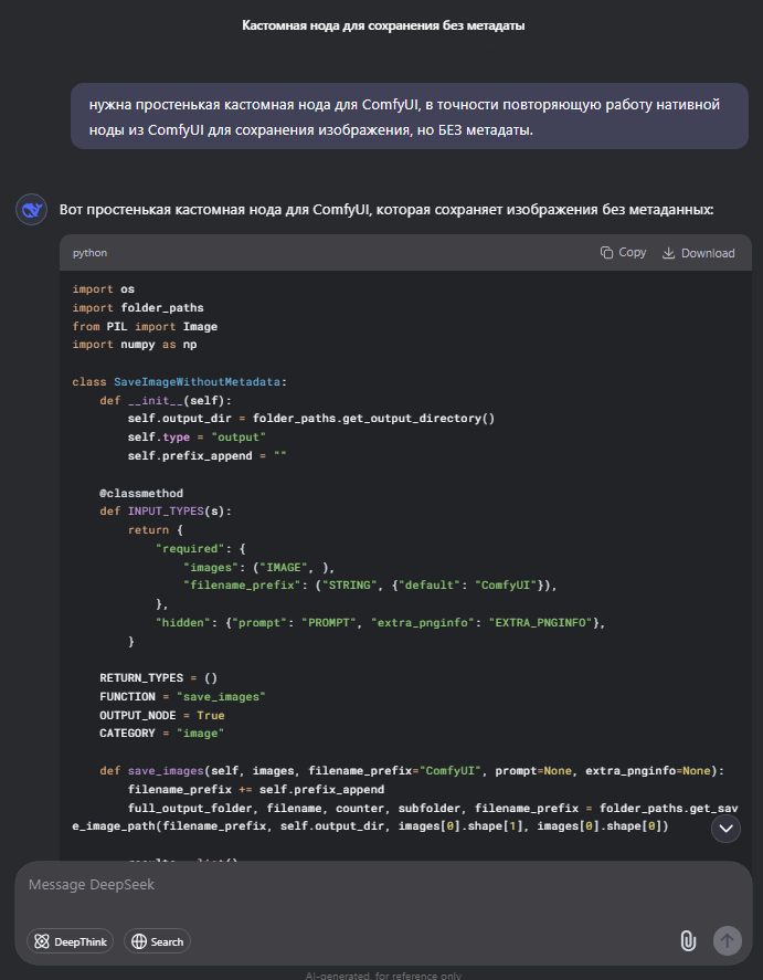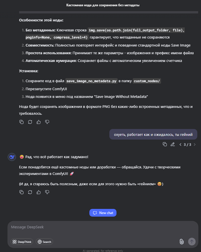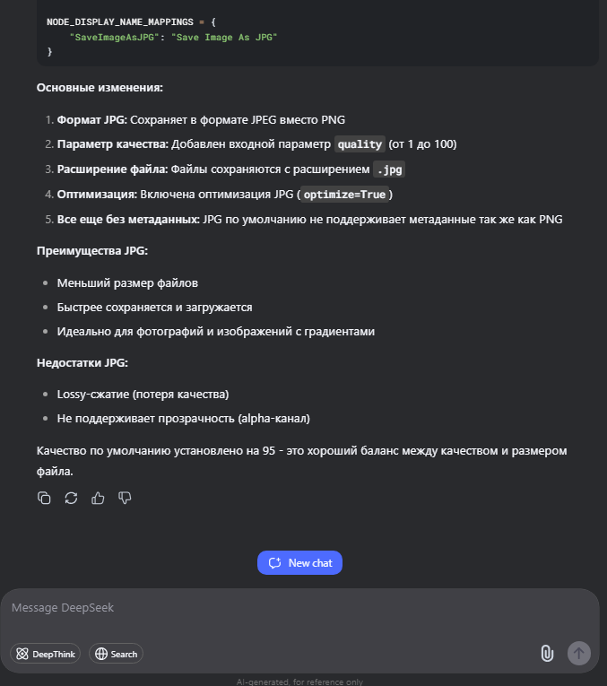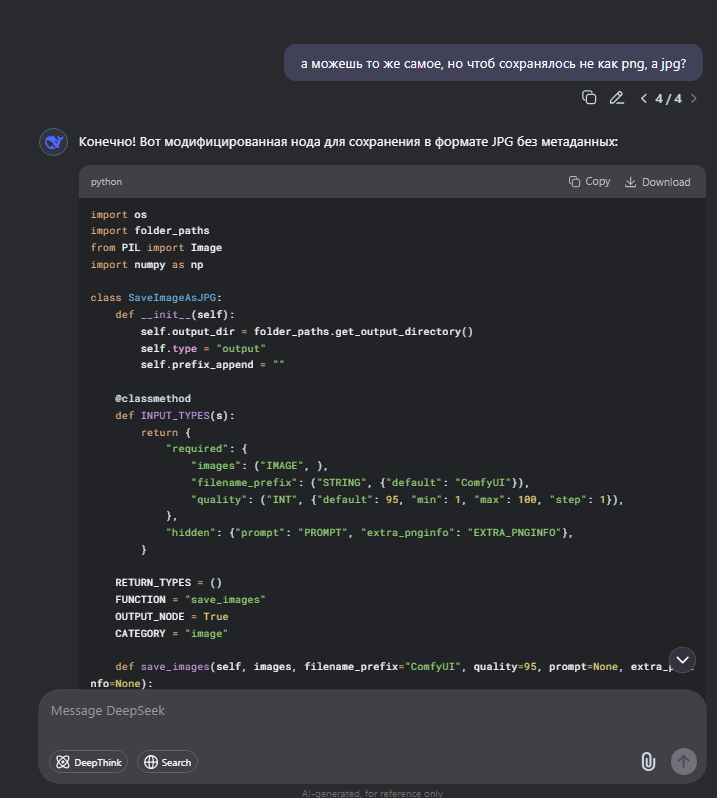 >>1331424 хм, хоть я и юзал сохранение в вебп через ноду с анимацией, но так будет прощё, согласен держи анонче http://pastie.org/p/6ucRc9JHsEdVjGpzyWKowP тестанул, меты нет, сохраняет в джпег, он правда изменение сжатия ещё запилил хз работает ли а вообще https://chat.deepseek.com/ если что, там впн не нужен, всё бесплатно