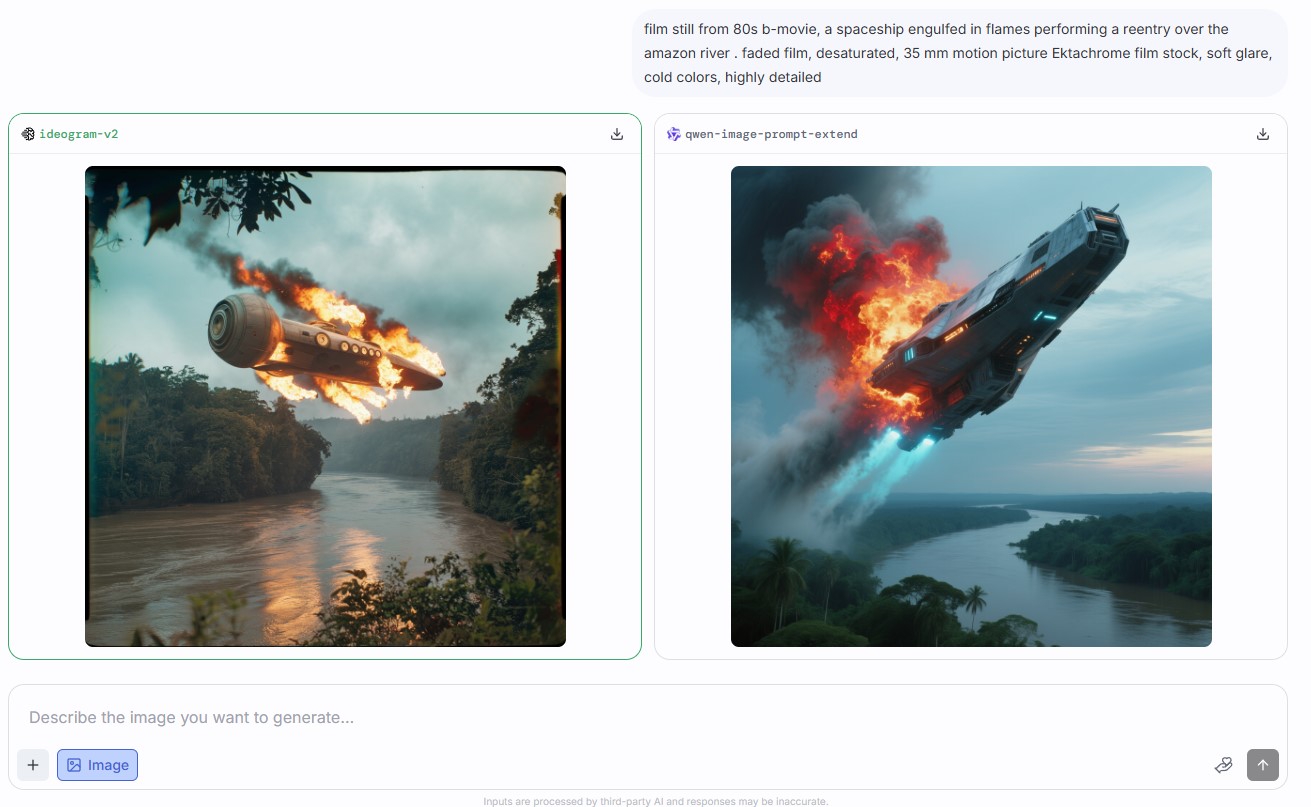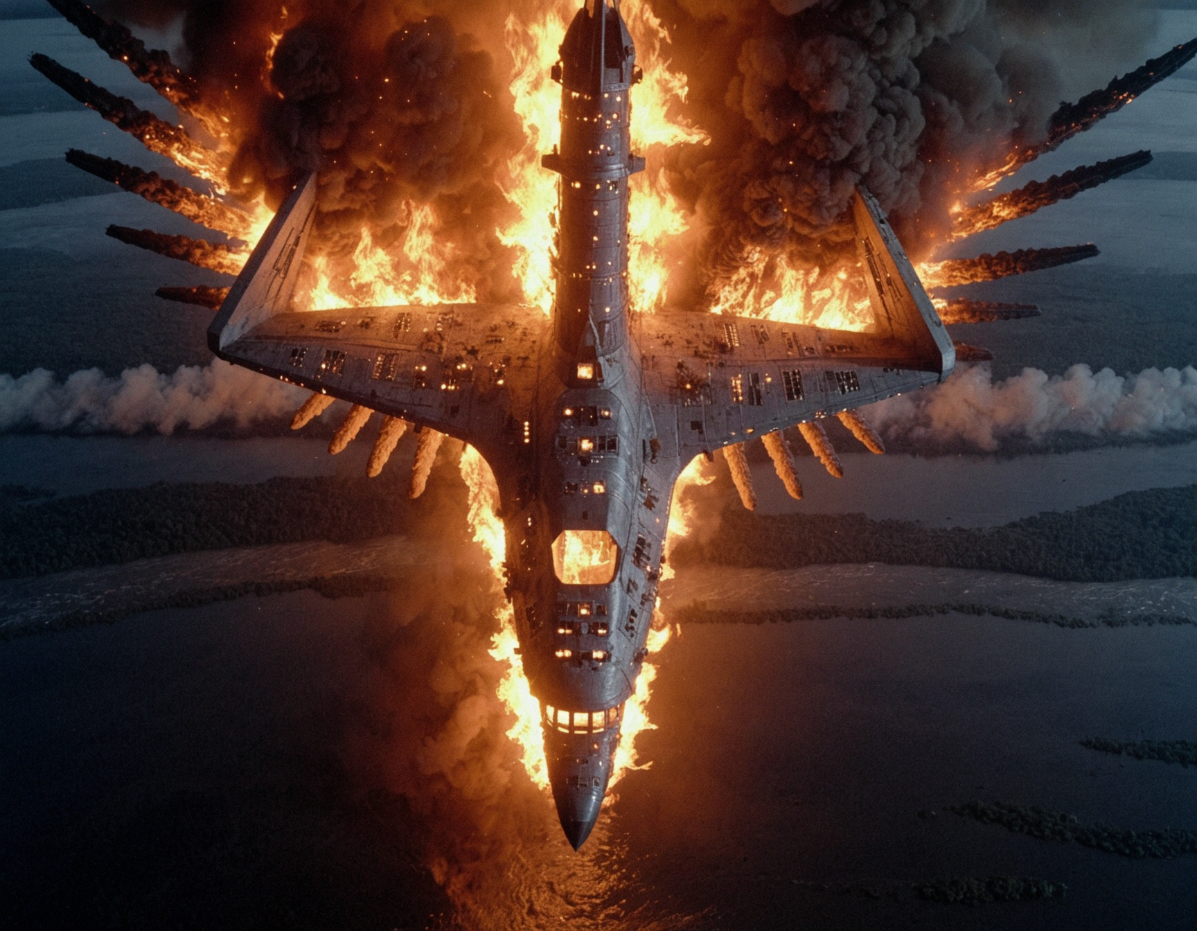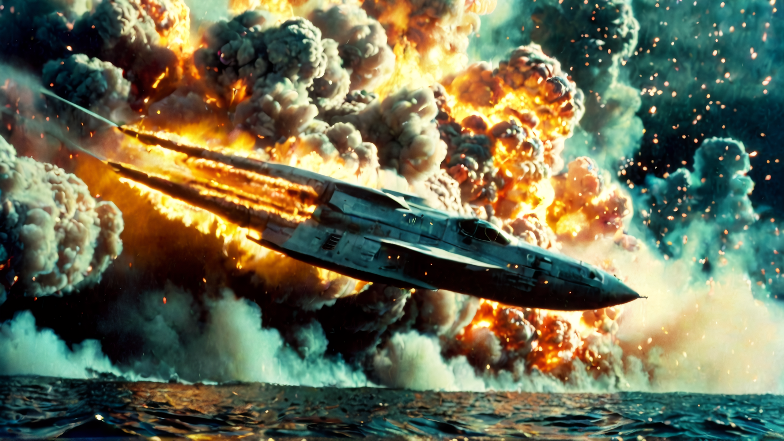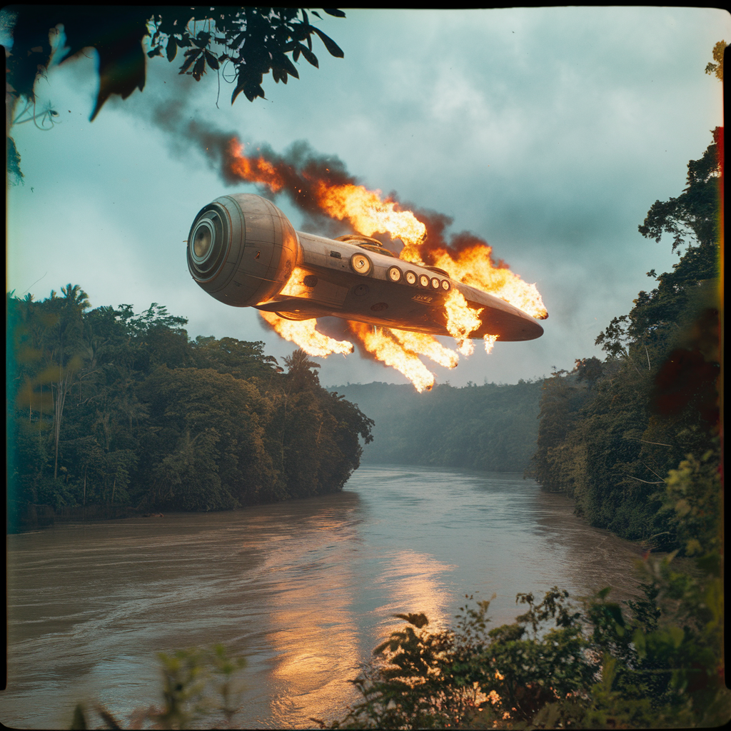 >>1332174 film still from 80s b-movie, a spaceship engulfed in flames performing a reentry over the amazon river . faded film, desaturated, 35 mm motion picture Ektachrome film stock, soft glare, cold colors, highly detailed