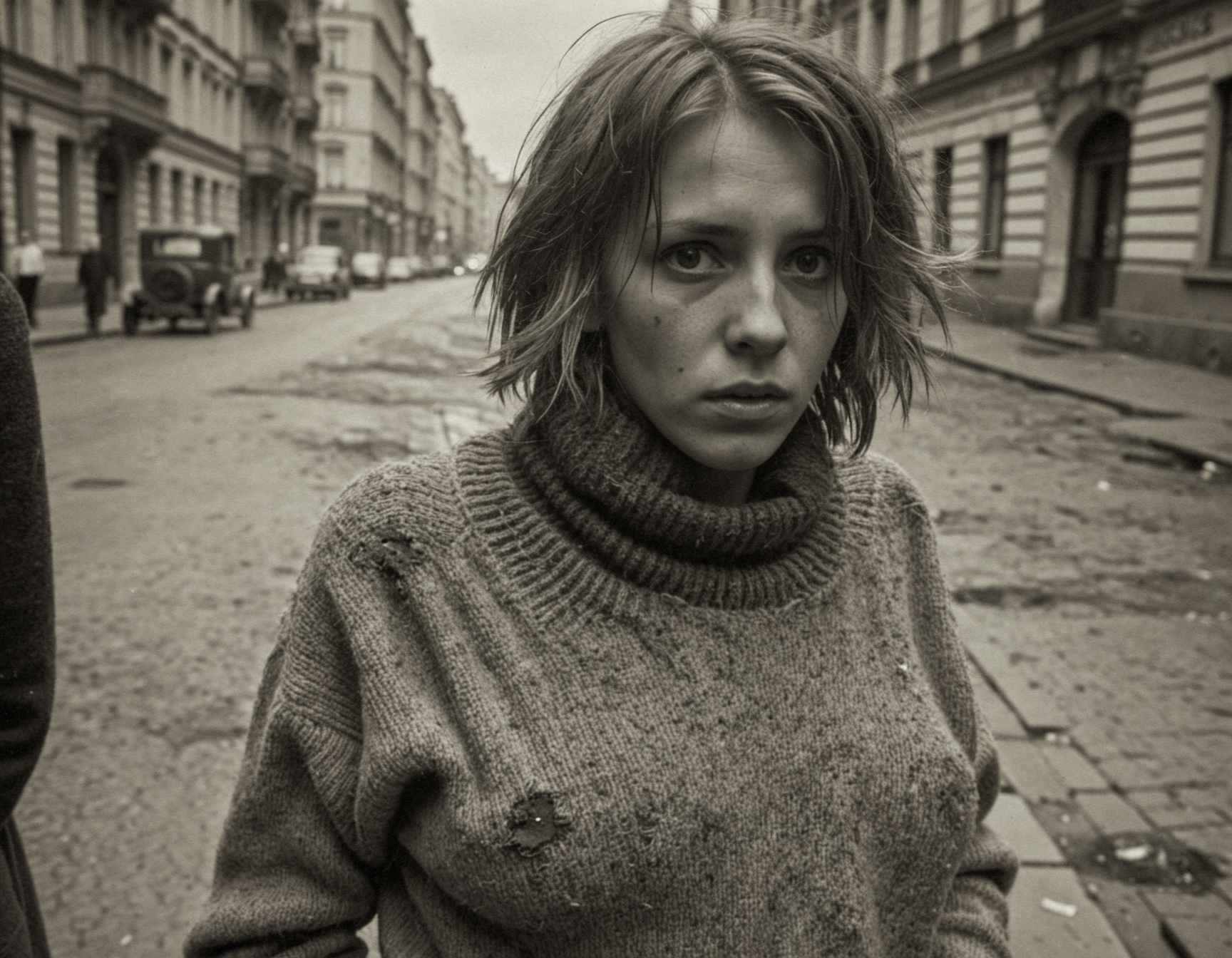 Кстати то же самое и с ботинками. Они старые, но за ними хорошо ухаживали, они сделаны из хорошей кожи. Они целые. Только юбка ок. Свитеру нужны затянутые петли, прожжёное пятно, чуть потянутая нитка на рукаве. Пока что всё это бутафория и реквизит.