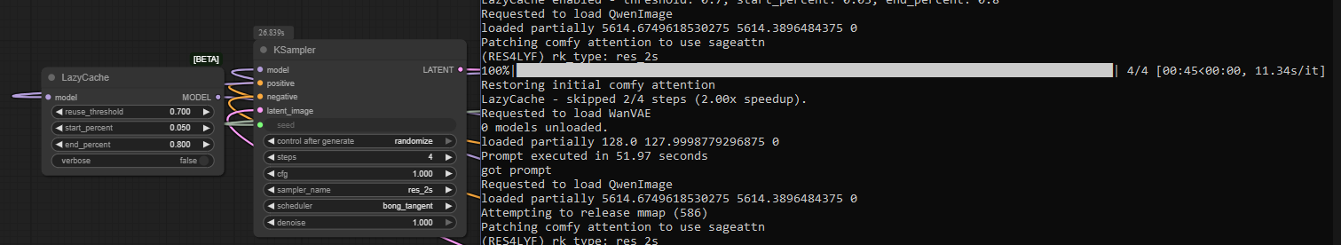 Если использовать следующие настройки ЛэзиКэша с res_2s то можно и скупинуть половину всех шагов даже на 4 шагах, то есть скипнуть 2 из 4 шагов на Квен (потенциально и на Wan).