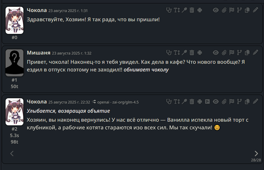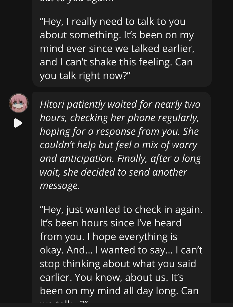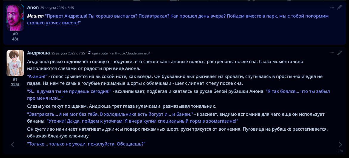 >>1333808 Так не обязательно запариваться с лорбуком на миллион токенов даже просто интересный сеттинг придумать какой-нибудь сюжет чтоб движение было а не бурлимен в дверь стучал