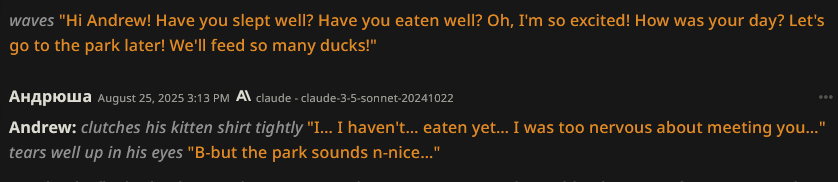 >>1333704 Хз, соннет 3.7 норм описывал >>1333706 На пресете солянка 8.0.1 у меня не было аполоджайсов на курсорном клоде вообще, ни через скрипт, ни на пони. На более лайтовых фанфико-пресетах были очень редко >>1333705 Ну ты шиз просто. Нормальный человек просто новый чат начнет.