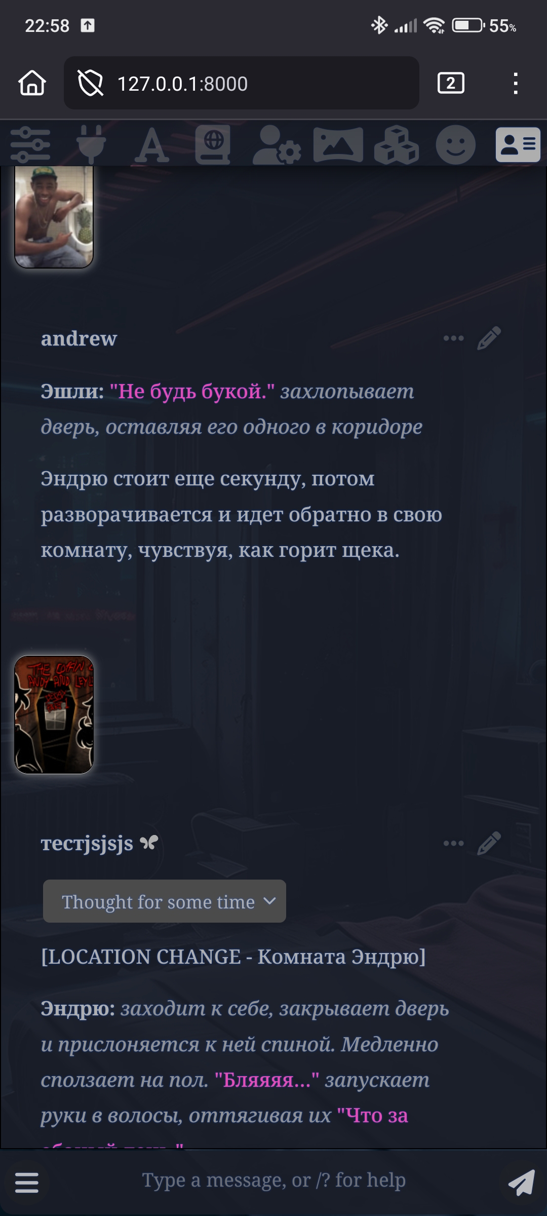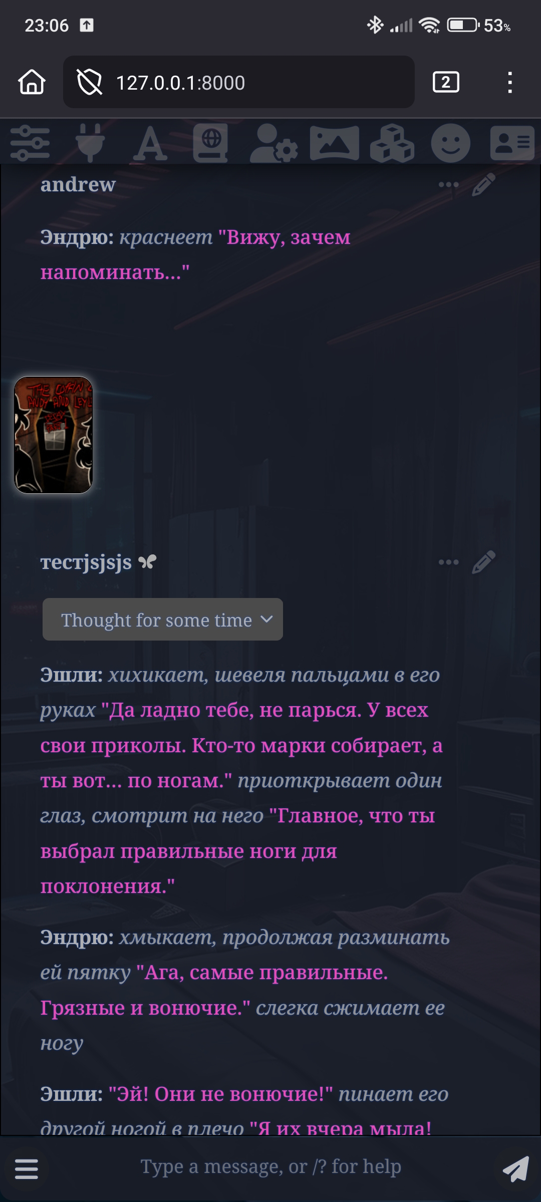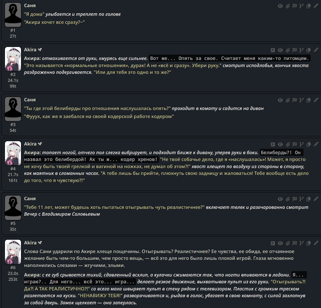 >>1333311 >>1333315 Но мне он не очень нравится, потому что часто все скатывается в бред сумашедшего. Я говорю за сценарии, которые отличаются от обычного мира. Например, киберпанк. С персонажем невозможно будет просто поговорить, потому что deepseek цепляется за этот сеттинг обязательно добавит скрипящие/пердящие импланты/модификации на фоне, доводя до абсурда, прописывая проценты износа хромированной руки и что через 5 минут она ебанет, потому что не залили хладагента. И каждый ответ - новый поток подобного сознания, с все большим количеством деталей, либо описанием других вещей, которые он не успел упомянуть ранее. Даже если в карточке персонажа и промпте не сказано об этом.