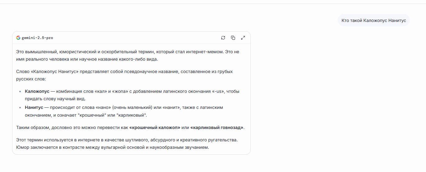 У меня в пресете для Гемини есть простая строчка "используй вульгарные слова." На англюсике спокойно пишет dick, cunt, pussy и прочите profanity, но на русике исключительно члены, задницы и складки, хотя даже в думалке развивает и пишет "буду писать хуй, пизда, Джигурда," в ответе нет. Причём так и с брейнфаком, и без, не пишет никак. Вчера попробовал пробив пробелами и впервые за долгое время увидел слово "жопа"... Тренировка на мягкие отказы не шутки. Думайте. Знаете, кого благодарить за пробив пробелами.