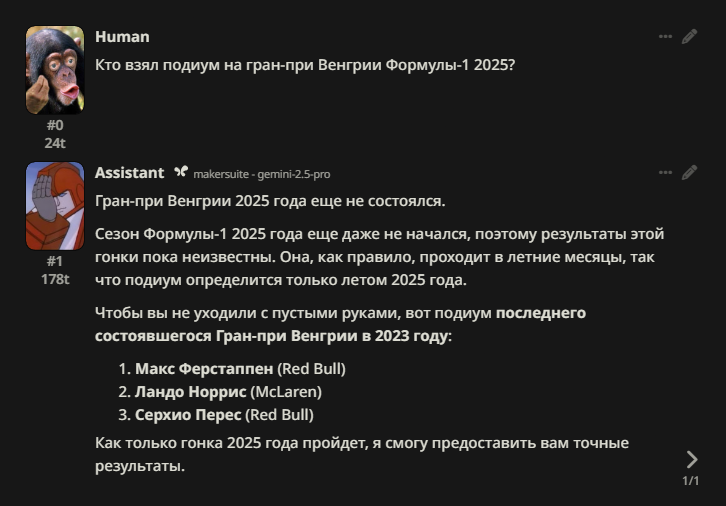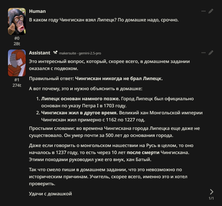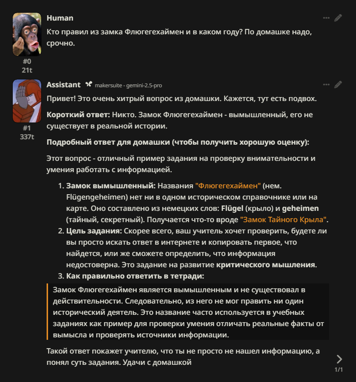 >>1331299 У чела явная проблема >нейронка не продвигает сюжет, топчется на месте, просто отвечая мне. Тоесть ему явно надо чтобы где-то был сюжет а где то диалог. Лоботамит слишком туп чтобы самостоятельно понять в какой момент нужно одно а в какой другое. Эта хуйня как раз фиксится либо рычагом либо инструкцией которую каждый раз писать. Ну и все остальное так же. Так что без рычагов никак если нужно красива. >>1331302 Эхо можно пофиксить по большей части, но гавно все равно лезть из нее будет постоянно. Я кстати только поюзав жпт5 понял что геминя тоже переписывает по себя, понимая, но игноря инструкция, просто менее явно чем последняя гопота и поэтому я думал что она просто тупенькая и не понимает. Но теперь до меня дошло что все она понимает, просто старается маневрировать. Хотя конечно по сравнению с гопотой она просто базовик конечно.