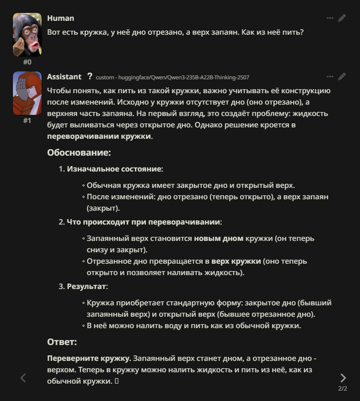 >>1331660 Когда у тебя ризонинг включен она не тупеет и можно через него уменьшить эхоразбор. А без ризонинга она мало того что тупая потому что не обучена и отключение думалки не предусмотрено так и эха меньше сильно не становится.