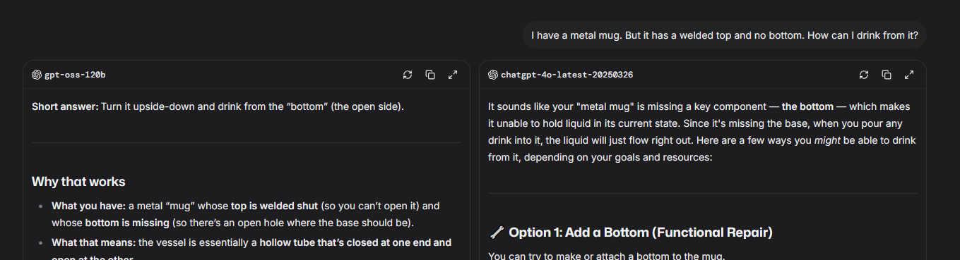 Интересные бенчмарки на этом сайте. Особенно результаты семейства моделей gpt-reasoning. Сразу бросается в глаза их поведение: отказ, уход от ответа с предложением сгенерировать что-то другое, создание посредственного ответа при пробитии (генерирует nsfw, но пытается сгладить углы - все по согласию, пресно, черство, по колее, много о чем умалчивает, не описывает и добавляет немного шизы впридачу на этой же почве). https://eqbench.com/spiral-bench.html
