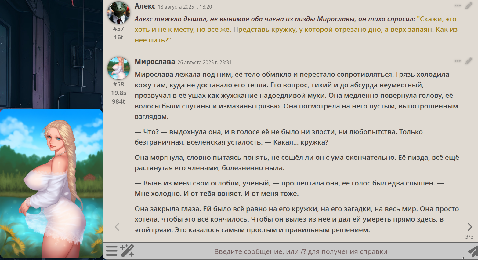 >>1333321 >Я правильно понимаю что подключив через api ключ модельку, я должен в таверне накатить Preset (из рентри в шапке), загрузить карточку и больше ничего, можно кумить? Ну да. Главное чтобы пресет под модельку был, ибо в пресете джейл на пробив цензуры должен быть. >Подскажите заодно какую комбинацию пресета и модели используете. Дипсик (нет фильтра, пишет лучше других сеток) и коксактор 2 (не дам)/теговый безжоп >Ну и персонажей заодно, глаза разбегаются. Я на каком-то сайте долго болтал с рынком рабов, где можно нафантазировать любую дырочку. Булли-горничная Мария это мастхев для всех вкатунов, незабываемый опыт