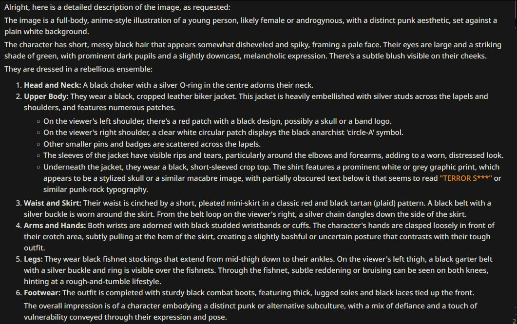 >>1333340 Использовал много разных промтов. Даже с минимальным количеством инструкций наблюдал подобное поведение (и там точно не было сказано про описания). Отправь, пожалуйста, ссылки на хорошие промпты, по твоему мнению. Я затещу их.