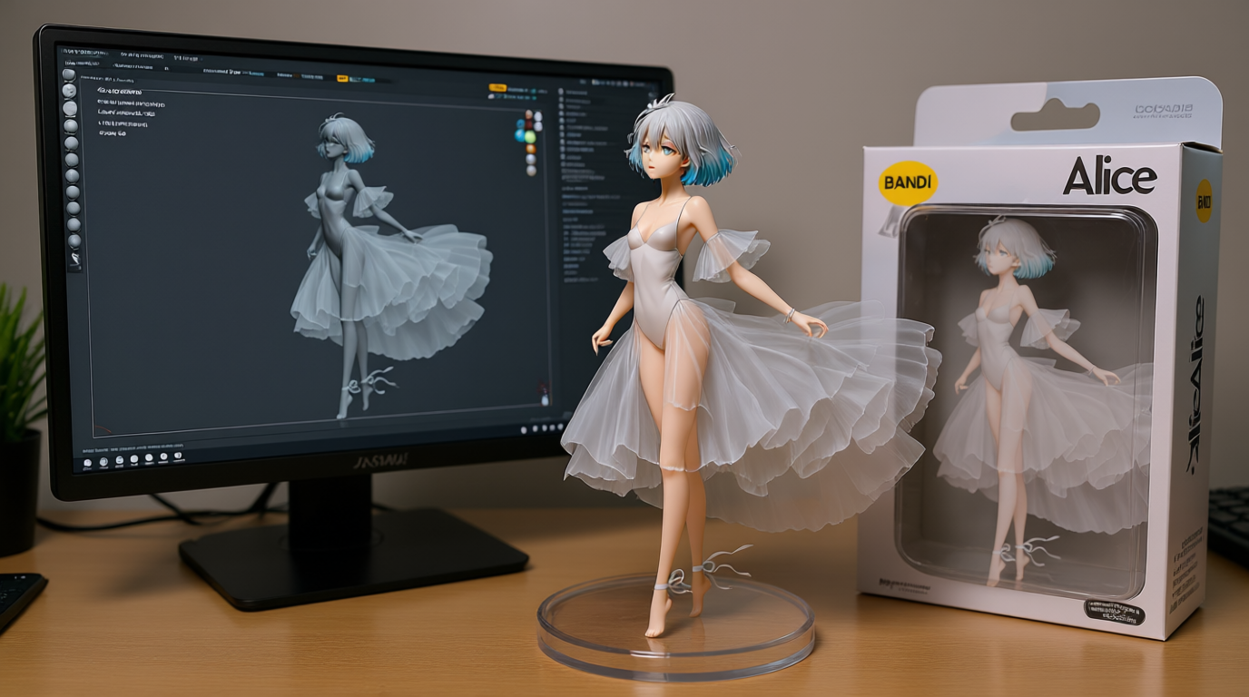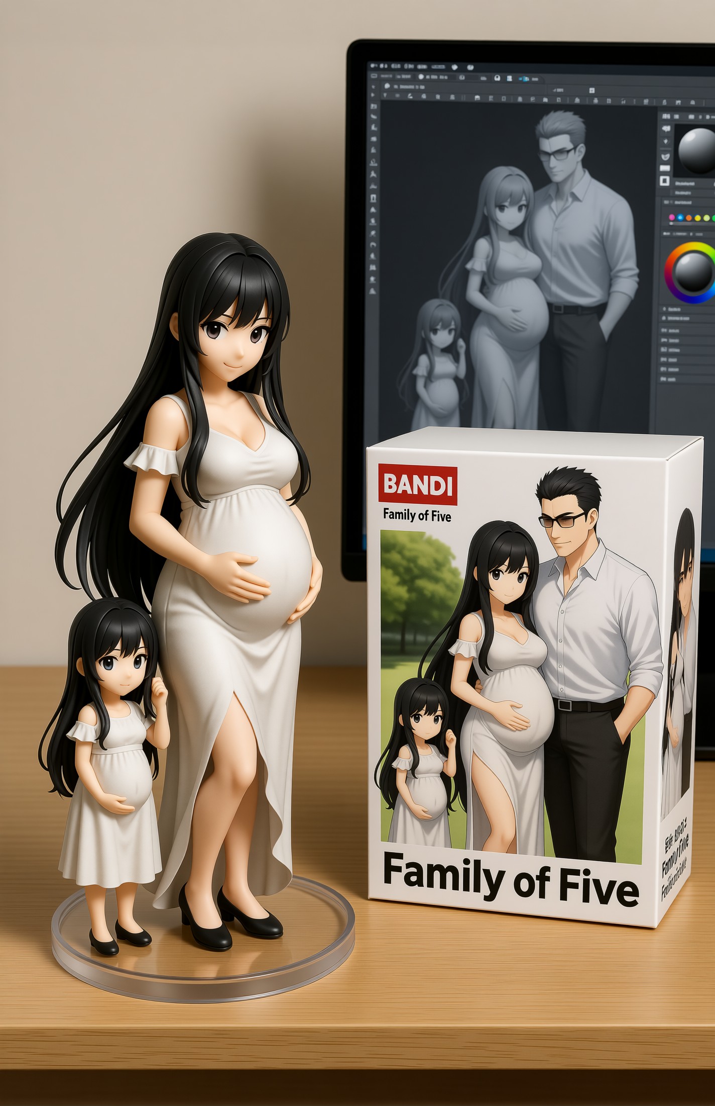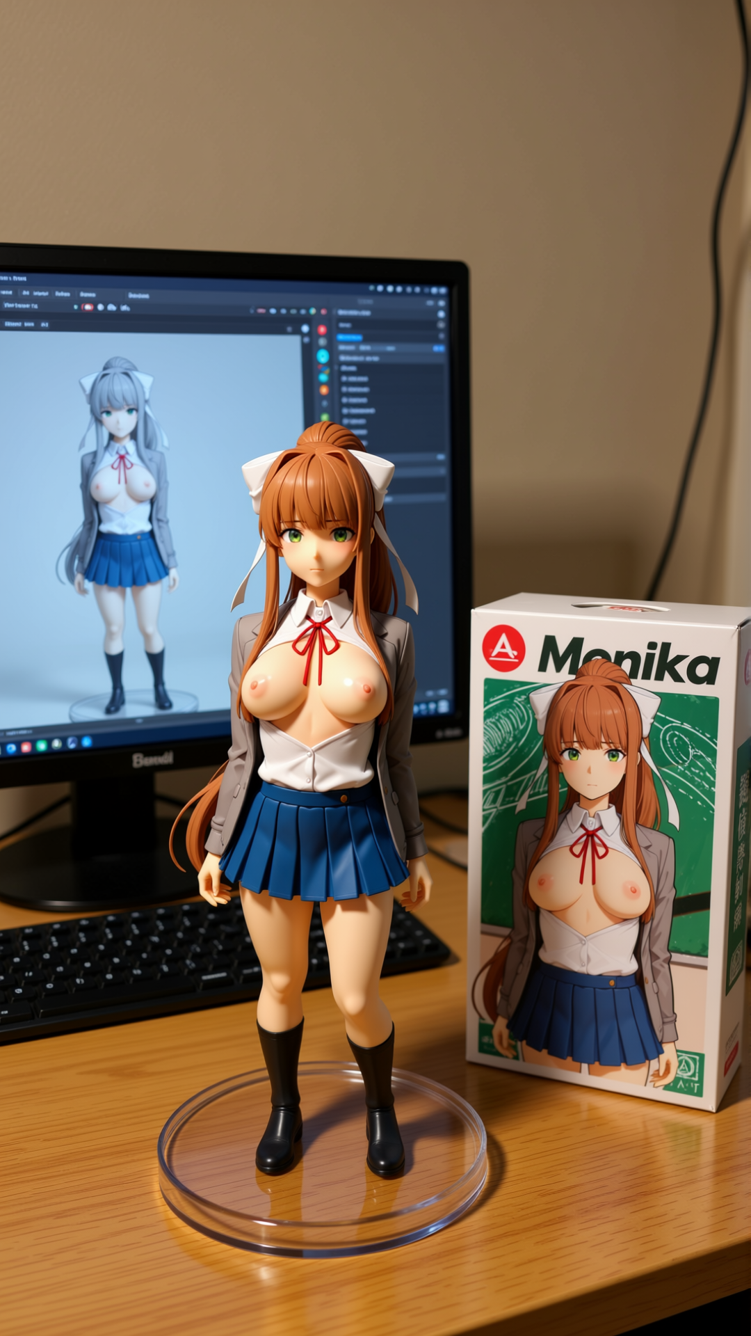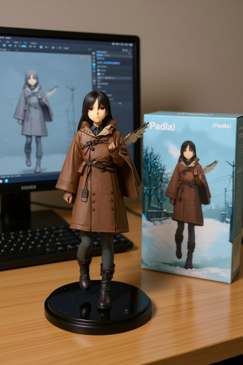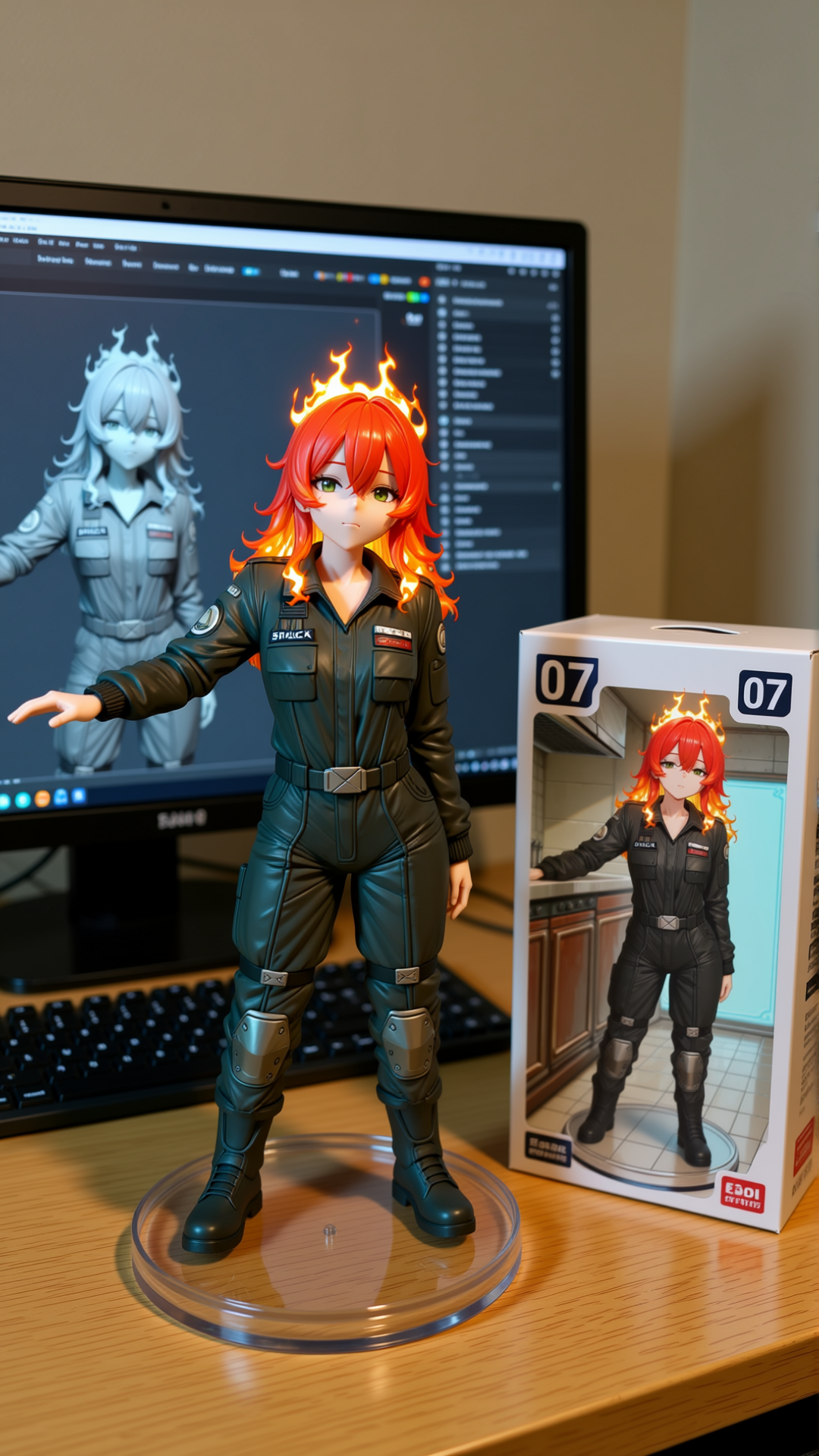 Qwen-image-editor: Create a commercially available 1/7 scale figure of the character in the illustration, with a realistic style and environment, high quality, and maximum detail. Place the figure on a computer desk, using a circular, clear acrylic base without text. On the screen, demonstrate the modeling process of the figure using ZBrush, which is still uncolored. Next to the screen, place a BANDAI-style toy packaging box printed with the original illustration and the character name "{girl_name}."