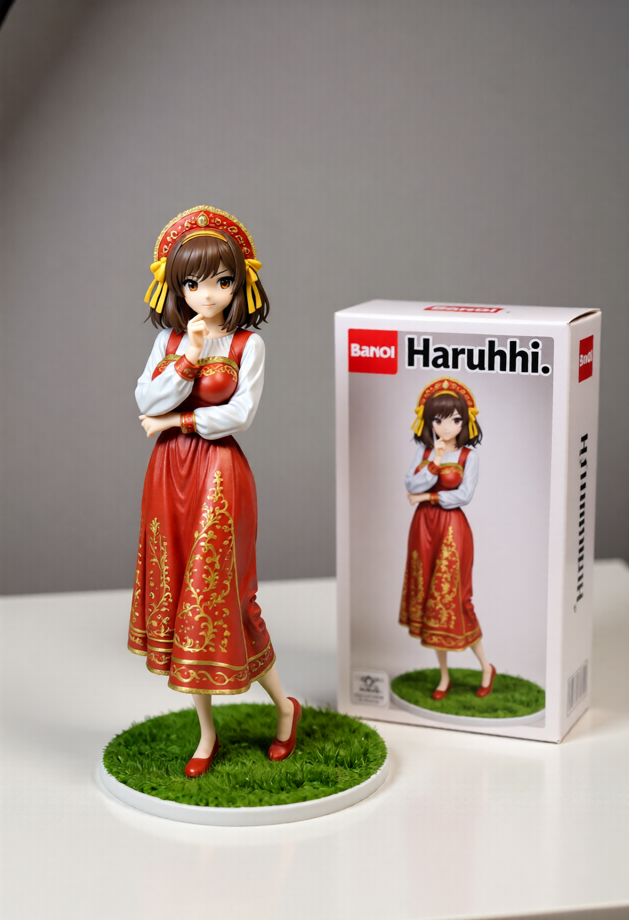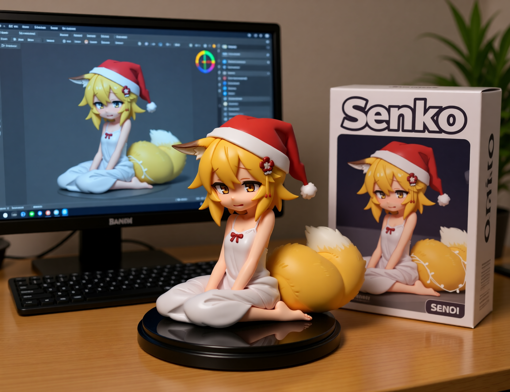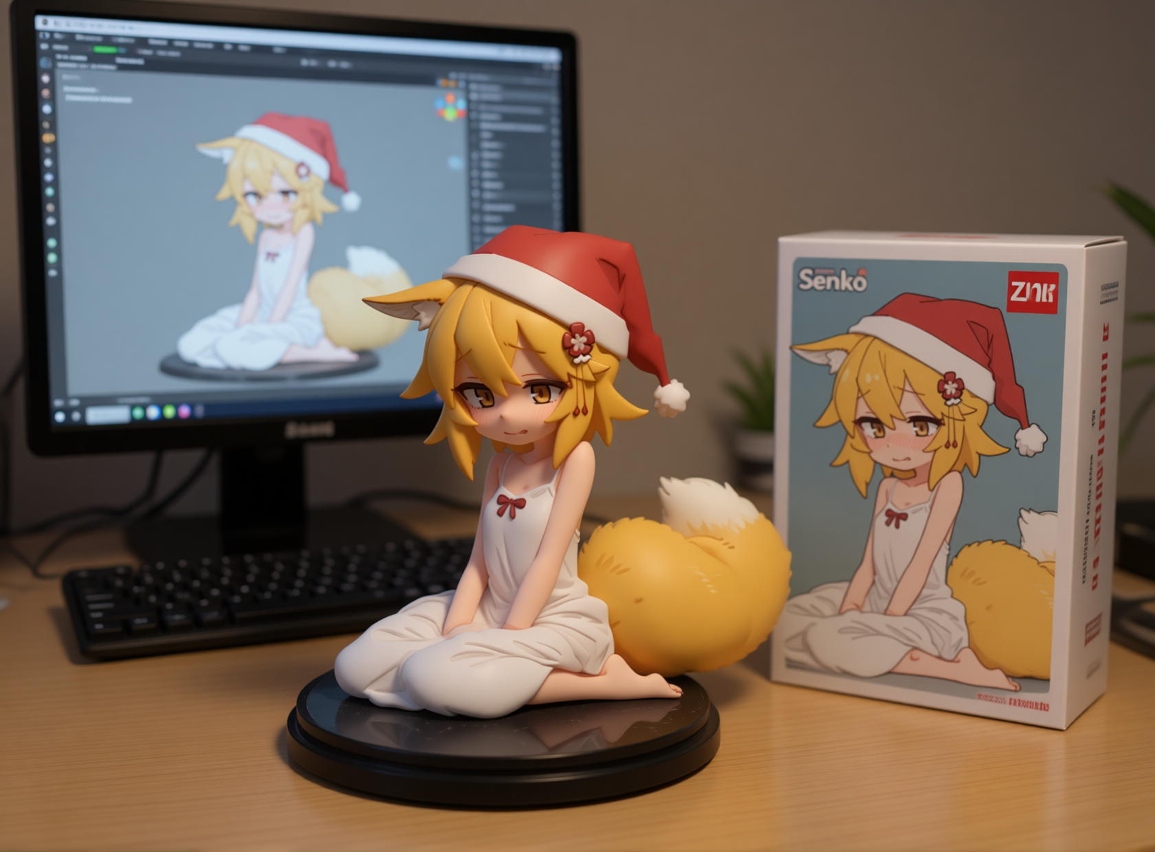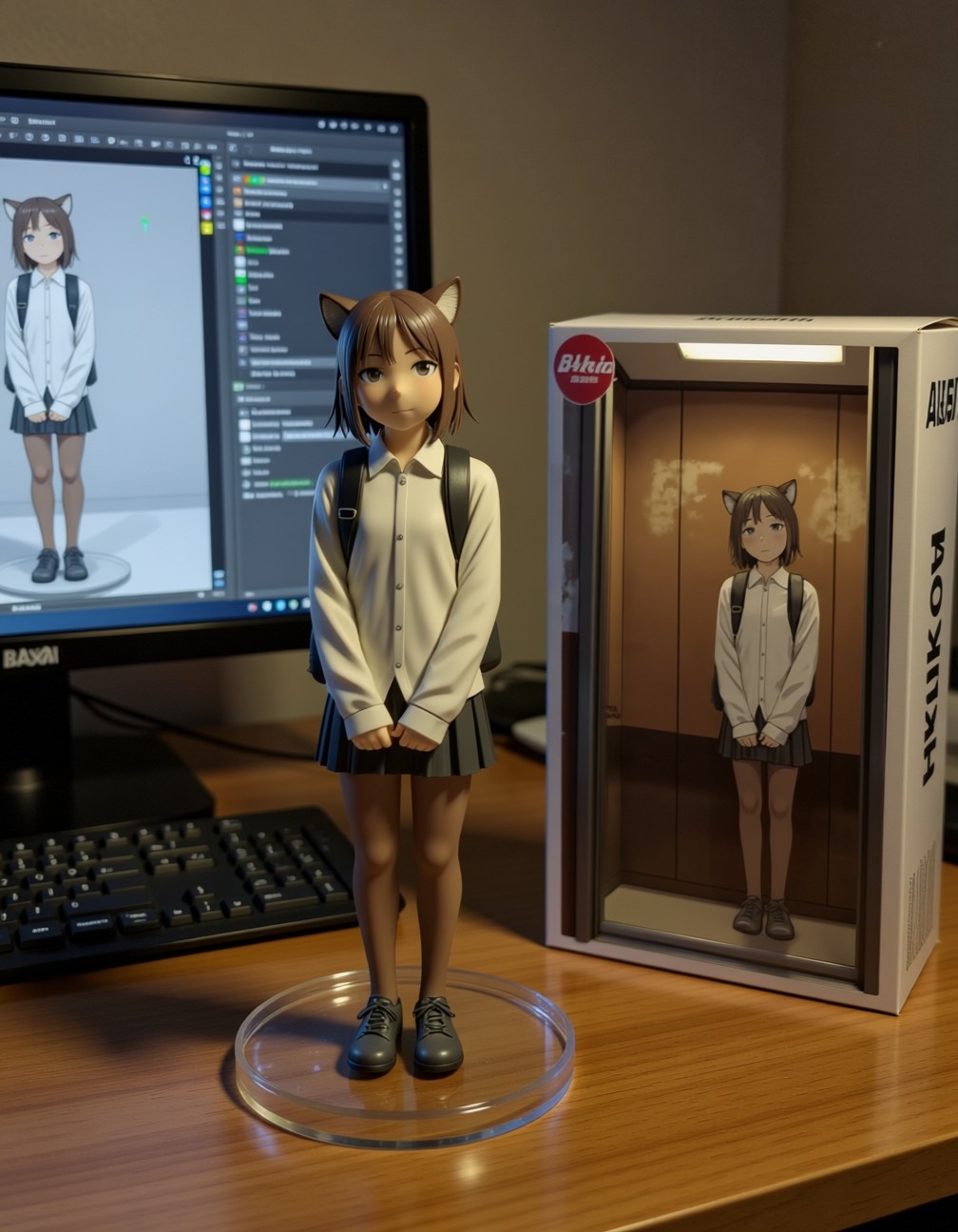 Qwen-image-editor: Create a commercially available 1/7 scale figure of the character in the illustration, with a realistic style and environment, high quality, and maximum detail. Place the figure on a computer desk, using a circular, clear acrylic base without text. On the screen, demonstrate the modeling process of the figure using ZBrush, which is still uncolored. Next to the screen, place a BANDAI-style toy packaging box printed with the original illustration and the character name "{girl_name}."