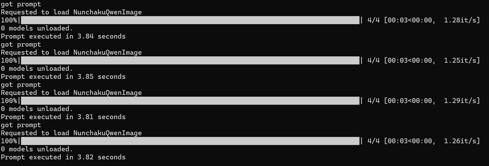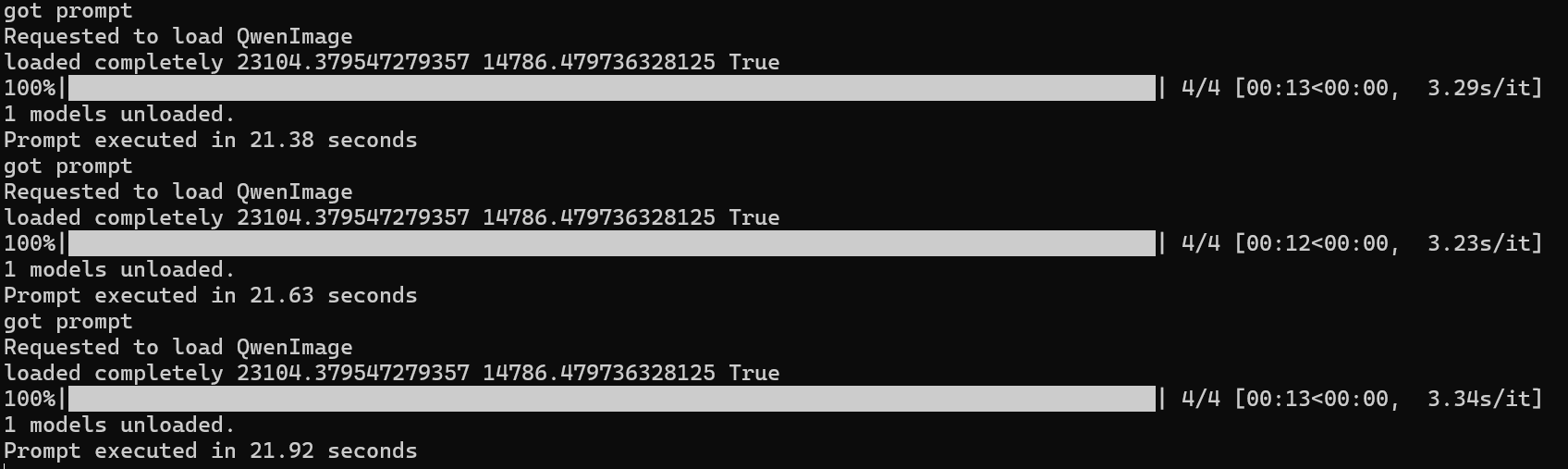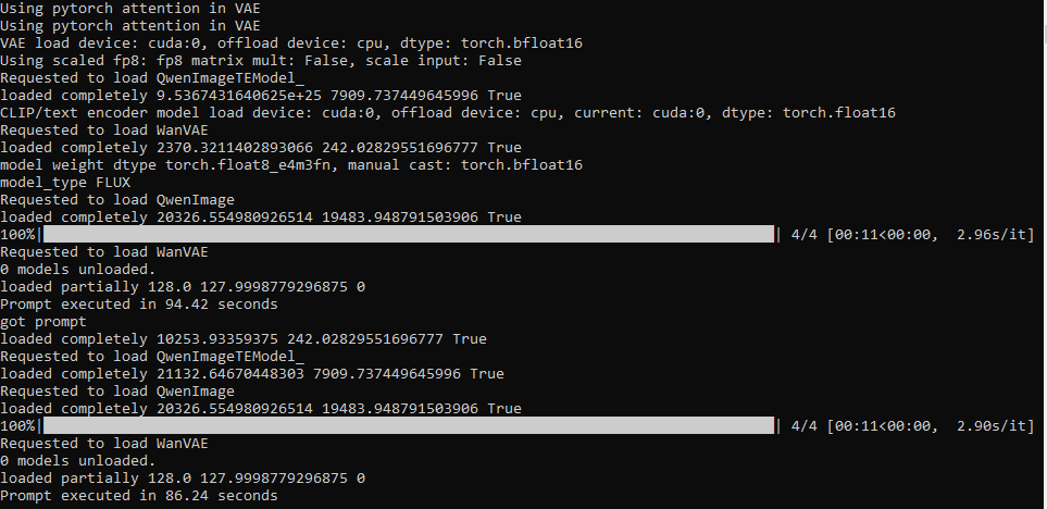 >>1348648 Хз, у меня проблема не со скоростью генерации, а с загрузкой модели. Использую дефолтный воркфлоу Комфи с лайтнинг лорой на 4 шага. Модель fp8, но каждый раз грузится по несколько минут при этом вся оперативка забита. Вот холодный прогон и второй прогон. Генерация 11сек, все вместе 86 сек на 4090.