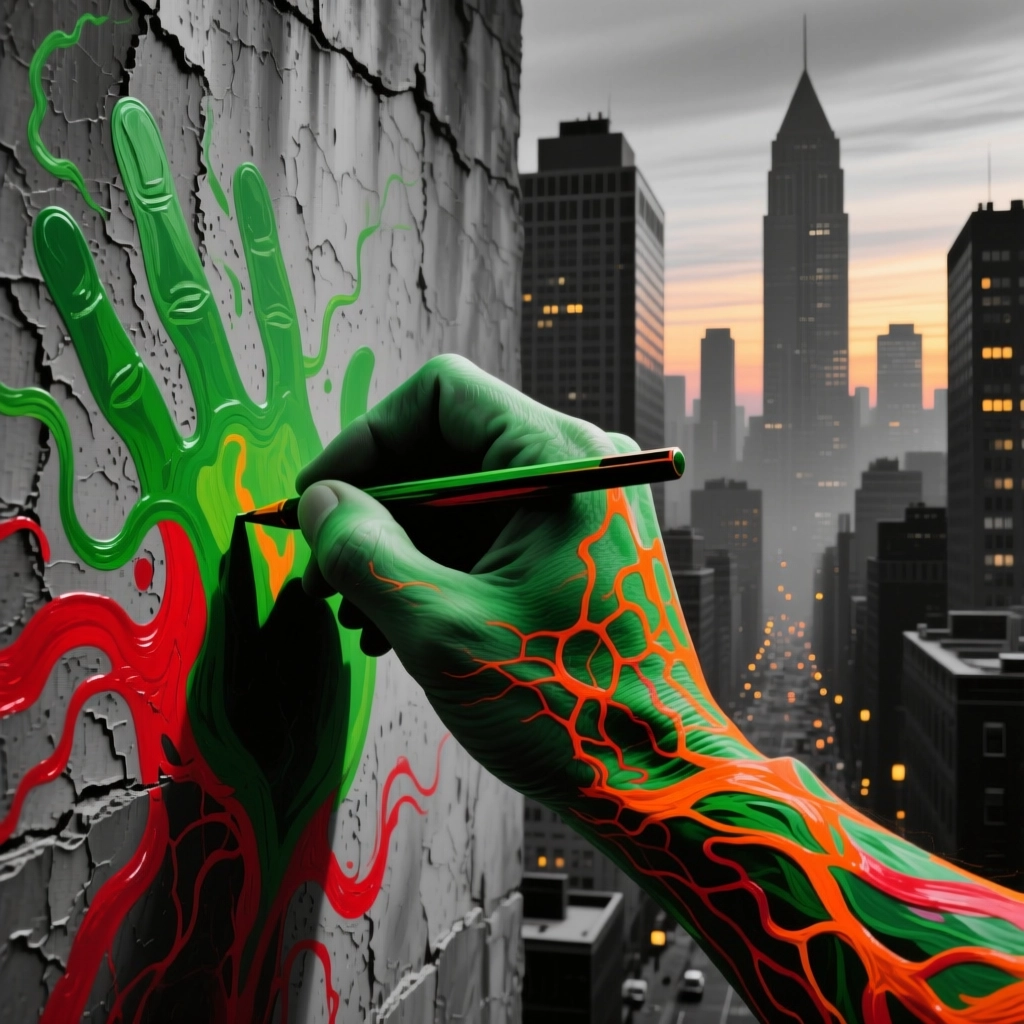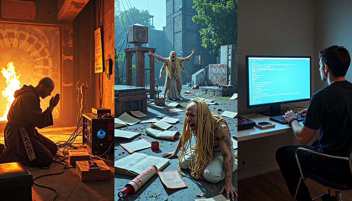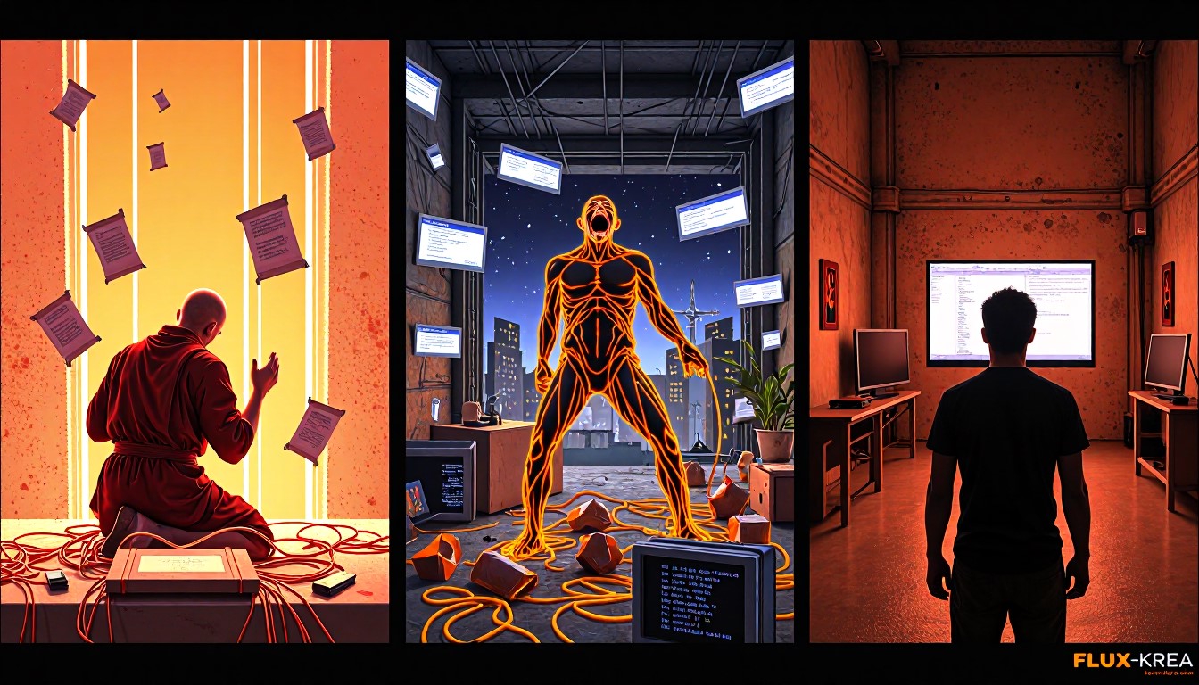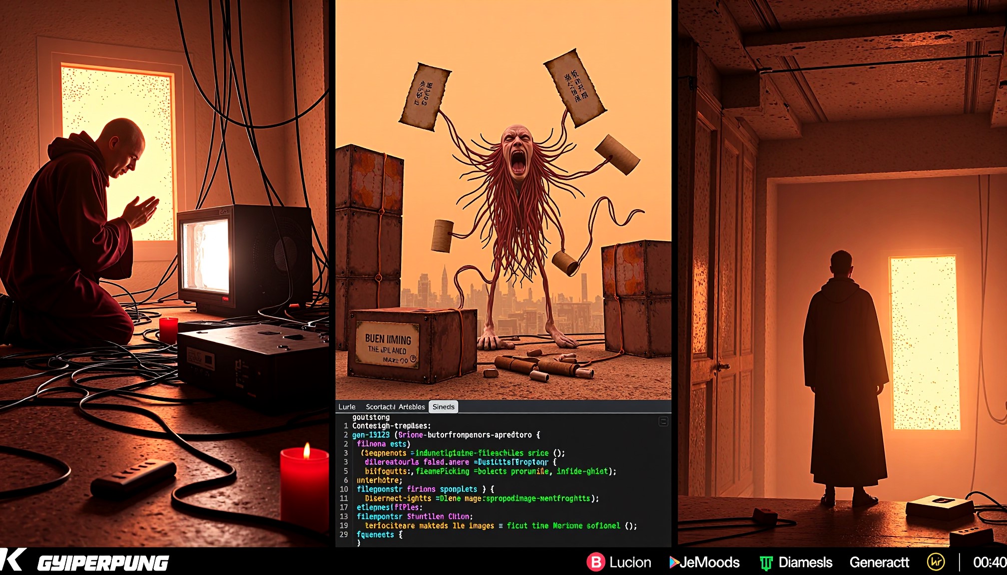 >>1351554 Style: brutalist techno-confession, manic generator monologue, post-ironic agony. Scene: A triptych of the generator's descent into madness and transcendence. Left panel: A cyberpunk monk kneels before a glowing GPU altar, tangled in cables and floating LoRA scrolls. He prays not for salvation, but for a clean render. Center panel: The battlefield of ComfyUI — broken nodes, mismatched file names, deprecated workflows, Chinese tutorial ghosts in 360p resolution. A screaming figure with spaghetti limbs made of Python code writhes in pain. Right panel: A lone artist stares at a single perfect image in the “output” folder. Eyes bleeding, fingers worn to bone, surrounded by cursed checkpoints, failed prompts, and the one disconnected node that somehow makes everything work. Mood: desperate, obsessive, transcendent. The generator does not seek beauty — he seeks to fuck the model until it gives him truth. Colors: scorched neon, rusted chrome, blood orange. Textures: glitch, burn, divine machine light. Goal: Generate a visual myth of the generator’s suffering and ecstasy. Let Flux-Krea channel the madness, the sleepless nights, the 12-hour scream into the void — and the one image that makes it all worth it.