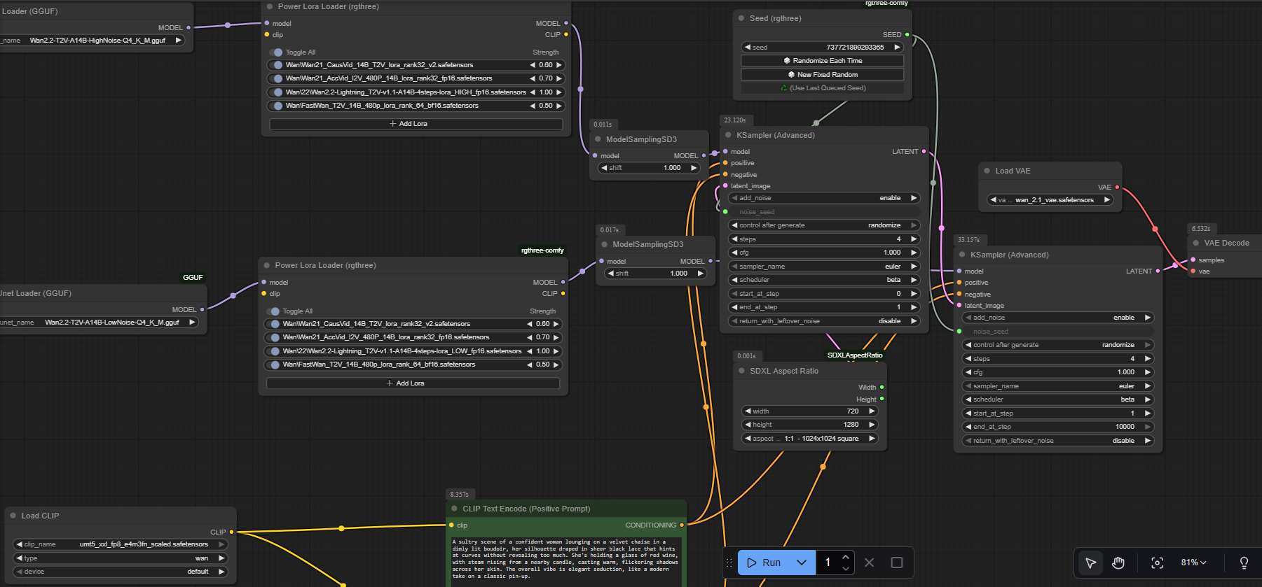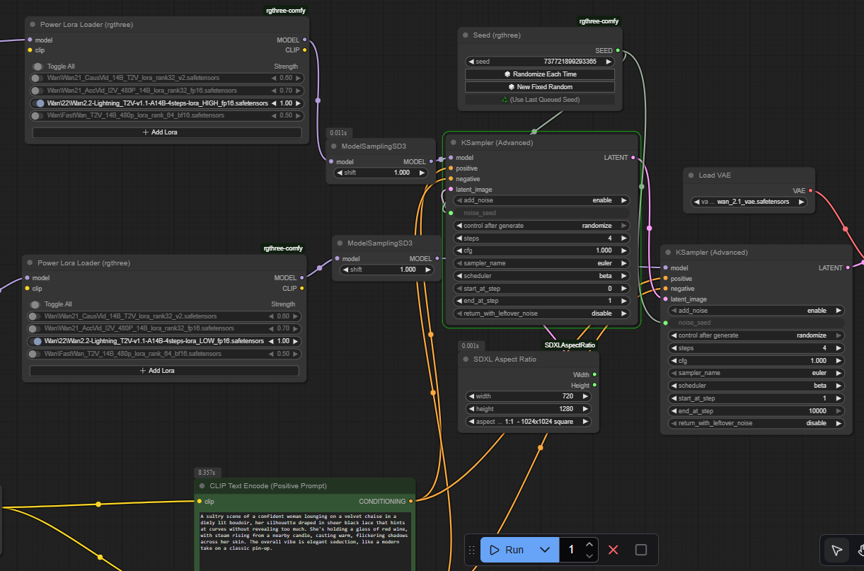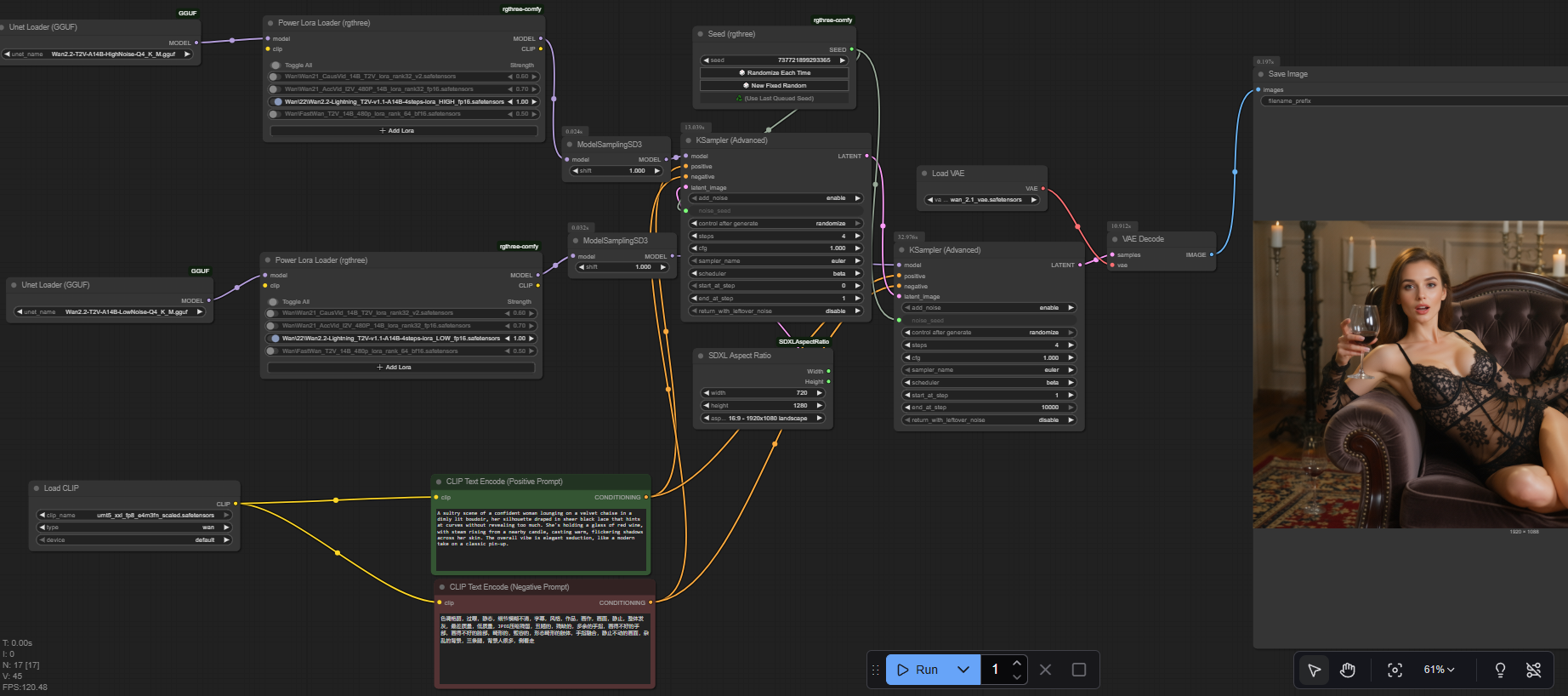 Но результат сам говорит за себя 1080p за 60 секунд (4 шага) это топчик. Может даже добиться 1024x1024 за 30-40 секунд. Но в Ване выбирать меньшее разрешение нет смысла, так как у него от изменения разрешения нативной генерации скорость не сильно падает. Правда на 1080p даже с этими лорами временами проебывается анатомия, приходится поднимать до 8 шагов, а это на 100% задержка во времени генерации.
