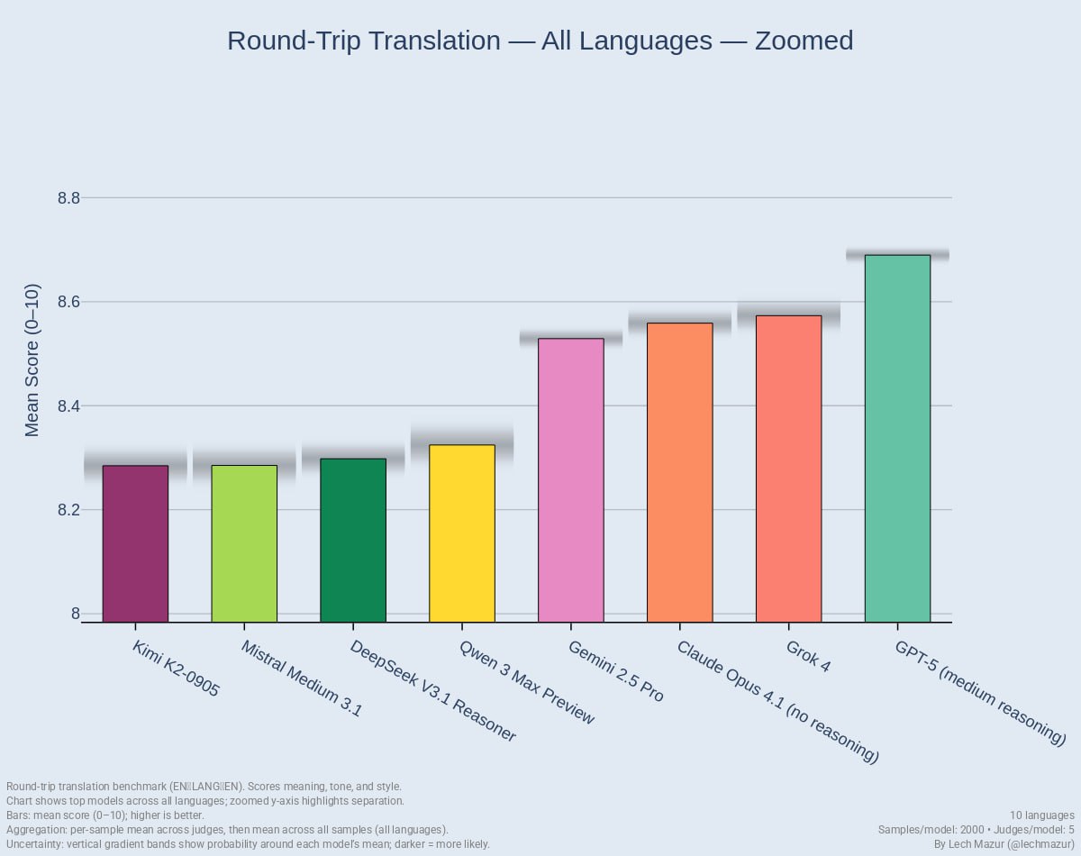 Хуже всех с переводом русского языка справляется Mistral Medium 3.1 (из тех кого протестили) Gemini 2.5 Pro кстати тоже результаты в русском языке, показала даже хуже среднего.. внезапно... и в испанском он тоже слабовата...