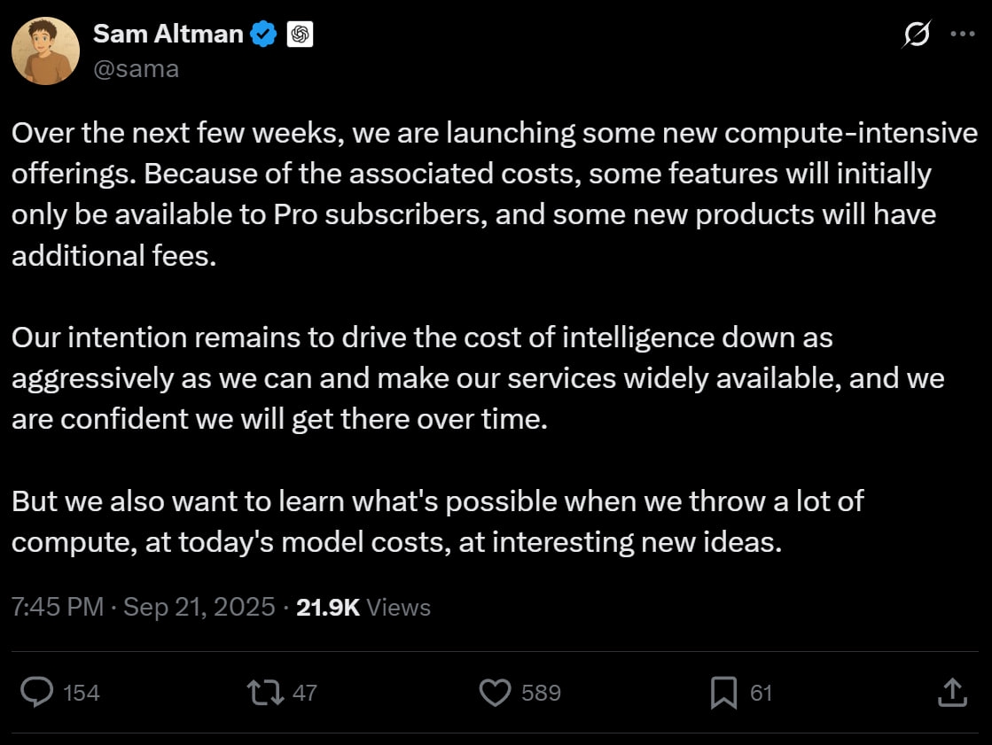 Нашей целью по-прежнему остаётся максимально агрессивно снижать стоимость интеллекта и делать наши сервисы широко доступными, и мы уверены, что со временем этого добьёмся.