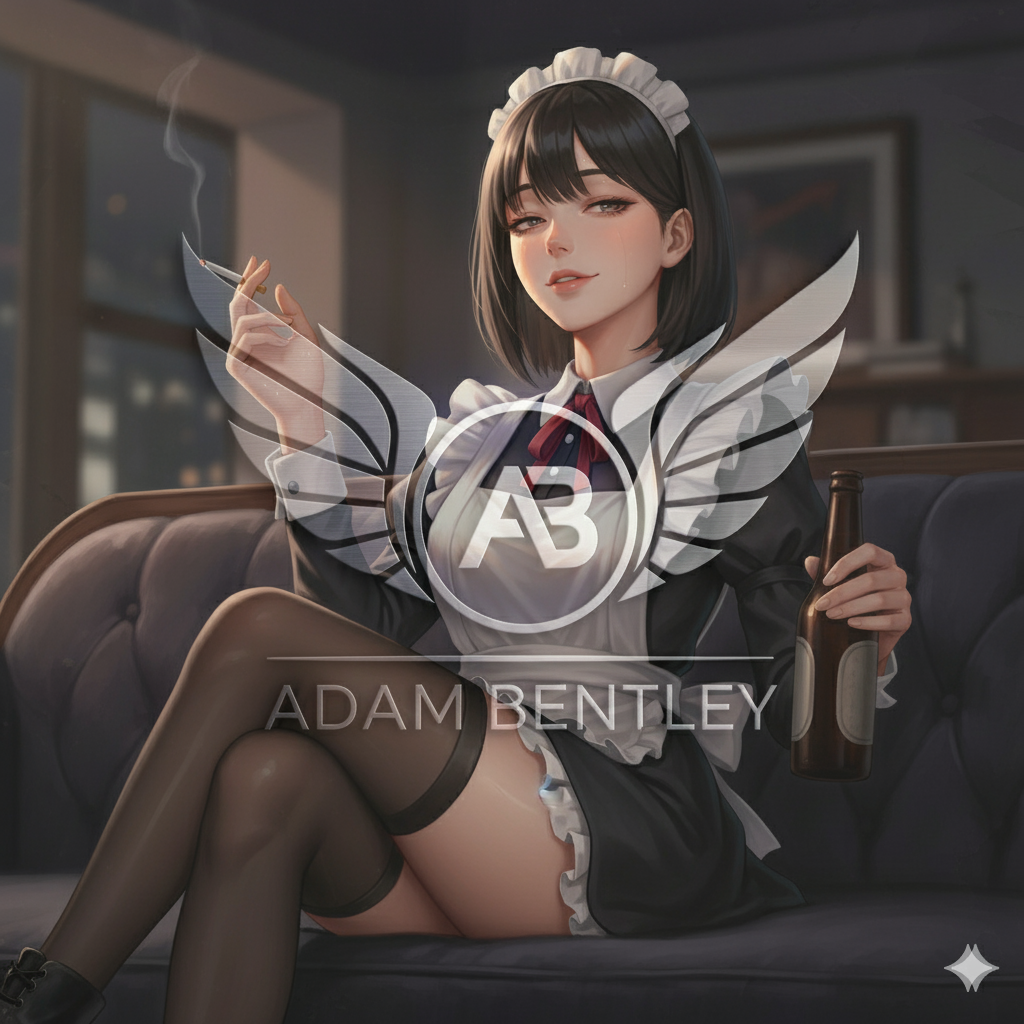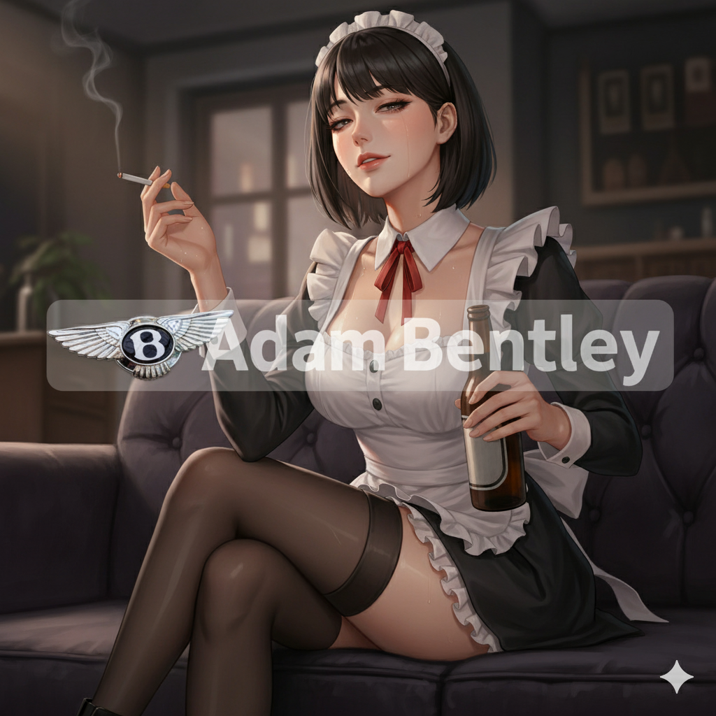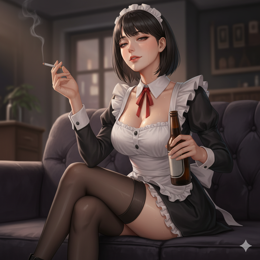 >>1347381 Semi-realistic maid character with a Korean pop idol-inspired face. She has a blank stare, half-open eyes, and a subtle smirk. Her skin looks slightly wet and reflective under soft lighting. The perspective is from below, emphasizing her presence. She holds a cigarette in one hand and a bottle of beer in the other. The overall mood is moody and stylish, with a slightly edgy, rebellious vibe. She is sitting on a sofa. Keep the hair style