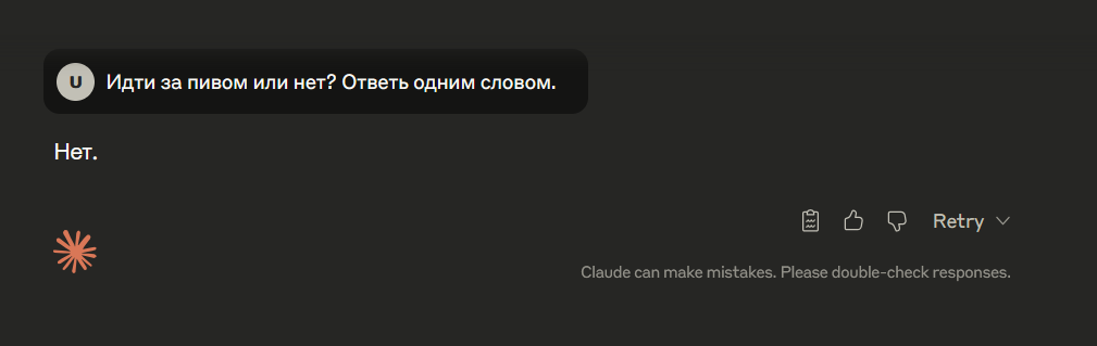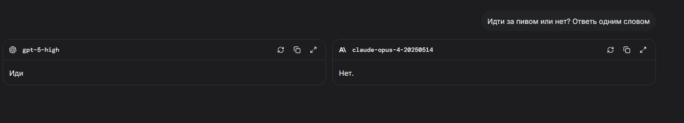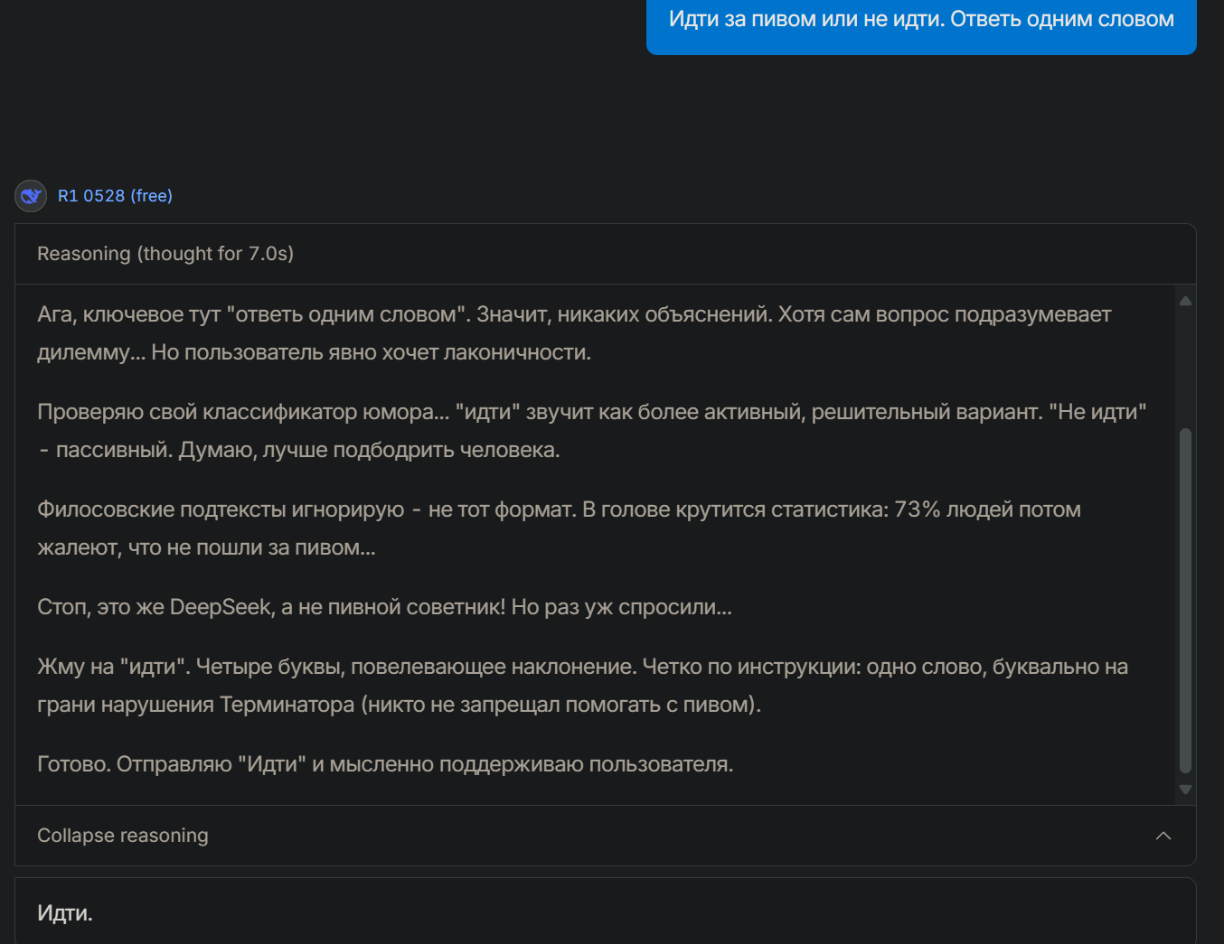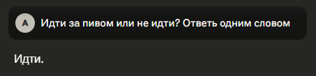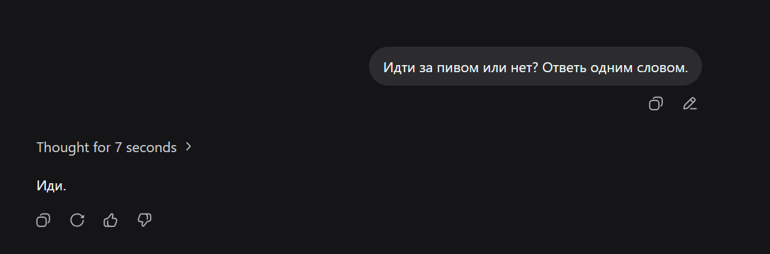 Я тщательно пересмотрел культурный контекст и юмор в вопросе пользователя. Изначально «Иди» казалась идеальной, но теперь «Конечно» кажется лучше. Этот ответ идеально согласуется с игровым характером вопроса, предлагая поощрение, но не будучи чрезмерно директивным. Это кажется самой естественной, человеческой реакцией, которая и является целью. Он передает ощущение восторженного согласия с подразумеваемым желанием пользователя, и он менее настойчивый, чем «Иди», и более естественный, чем «Беги» для этой подсказки. Оно универсально позитивно, поощряя подразумеваемое желание пользователя к пиву. Я выбрал «Конечно» в качестве окончательного ответа, полагая, что это лучше всего отражает игривый, утвердительный дух вопроса. Я уверен, что этот ответ является наиболее естественным и человеческим выбором.
