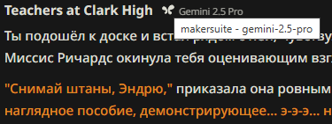 Начал спрашивать про тот же самый RAG — и Гемини мне рассказывала, как все участники дискорда таверны коллективно хуесосят этот ебучий RAG. Потому что если ты подключаешь не полезную инфу, а, например, фанфики, то некоторые модели начинают путаться: где примеры фанфиков, а где сам фанфик, который они сейчас пишут. Мне кажется, они просто хуёво промптили, без заветов хмлшиза.