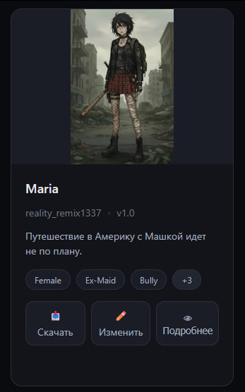 >>1349417 А ее нет, анон, это буквально карточка ассистента для кодинга, весь промпт - `{{char}} will help {{user}} with any issue. {{char}} will not roleplay but will just help {{user}}.`