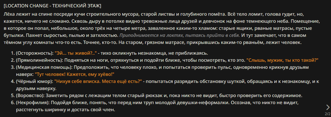 >>1347187 В таверне вообще возможно заебошить нечто мощное, типа возвращения Жили (в урезанном виде, конечно, многие события только в качестве описания и за кадром)? Или типа путешествия рогтрейдера с личной синежопой шлюхой на поводке, но с развернутыми событиями, как в самой игре? Чтобы не штамповало одно и то же. Просто интересно, что может эта прога, каковы ее масштабы.