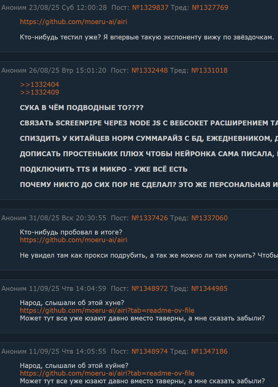 Ребят, я нашёл в таверне просто ебейшую технологию: RAG. Я спарсил все диалоги со всех каналов дискорд-сервера SillyTavern, и теперь, когда я что-то спрашиваю про таверну, в контекст первым делом подтягивается релевантная инфа из каналов разработки или помощи, где эту херню, что я спрашиваю, уже раз двадцать обсосали.
