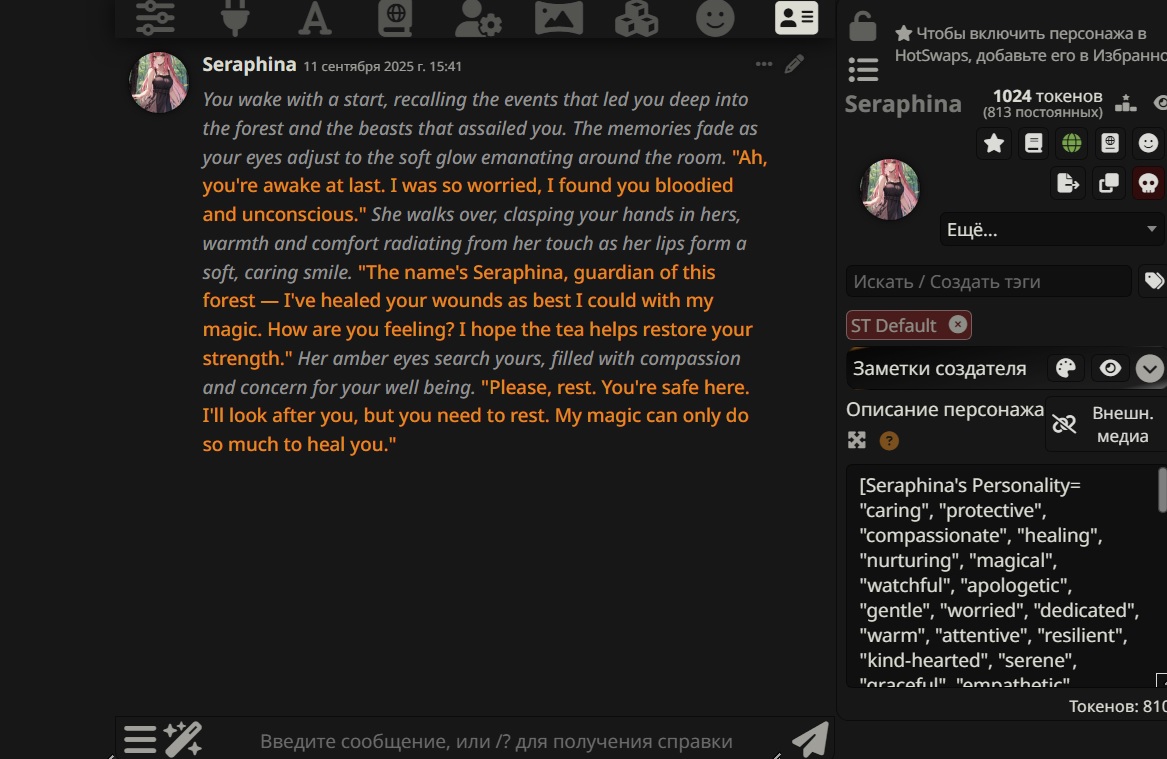 >>1347538 лол. я тоже пью. уже несколько дней подряд. сегодня еще не спал сутки из-за нейронки, карточку делал, и еще долго делать. у меня есть чела книга написанная от лица перса и я не знаю ,в лорбук цитаты из нее закинуть или в примеры речи и мышления перса типа