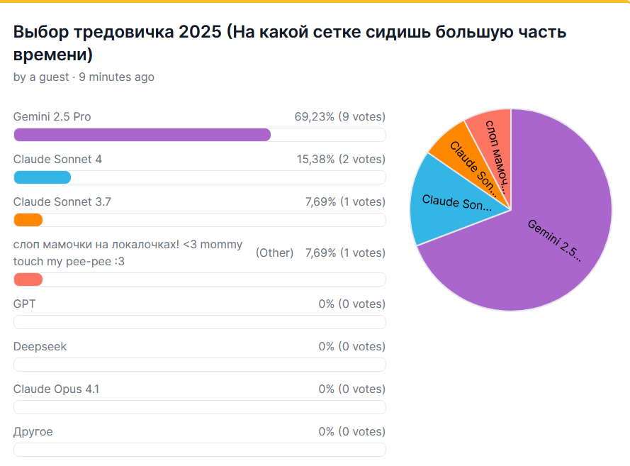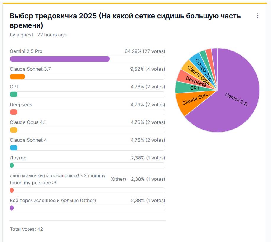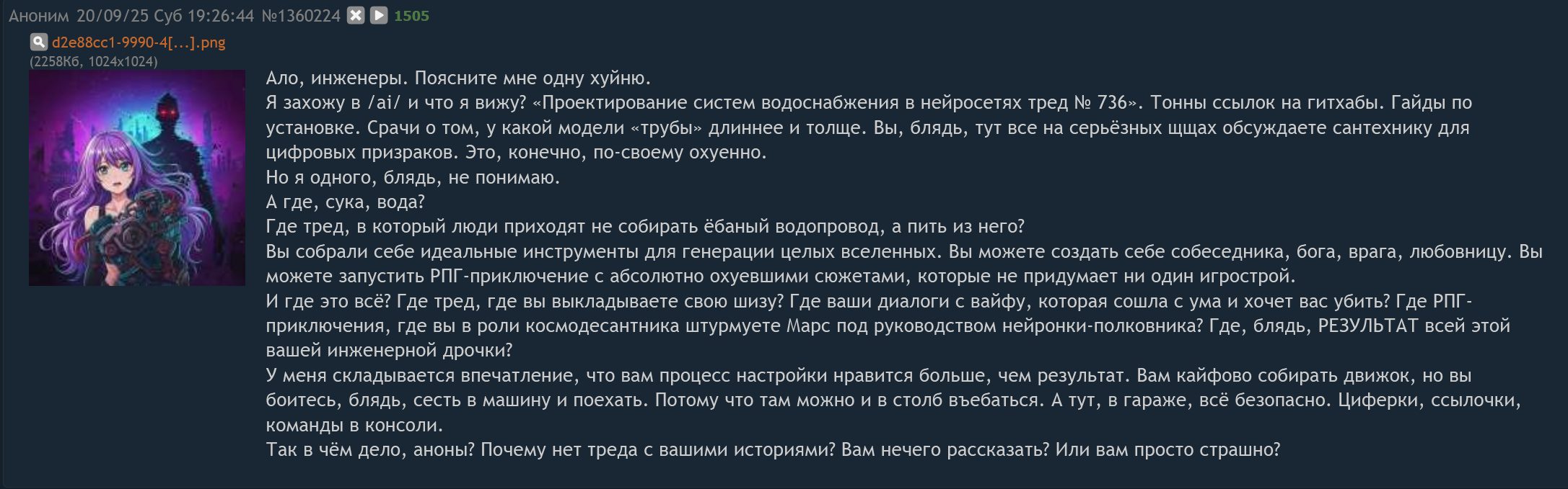 всё гайз, всё. я все нейронки попробовал и протестировал, все нахуй. grok, deepseek, moonshot, qwen, glm, gpt, соннеты, опусы, лламы, гемини, коммандоры, мистралы, пигмы. всё нахуй за 3 года попробовал. всё нахуй, точка. пришел к выводу. все существующие на данный момент сетки просто непригодны для сторителлинг рп. абсолютно ничего нет, вообще больше ничего, некуда идти и нечем пользоваться. единственная бывшая пригодная сетка, которая умерла самой последней, была гпт 4.5.