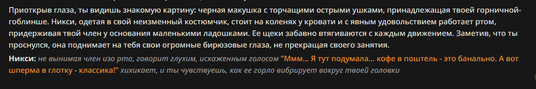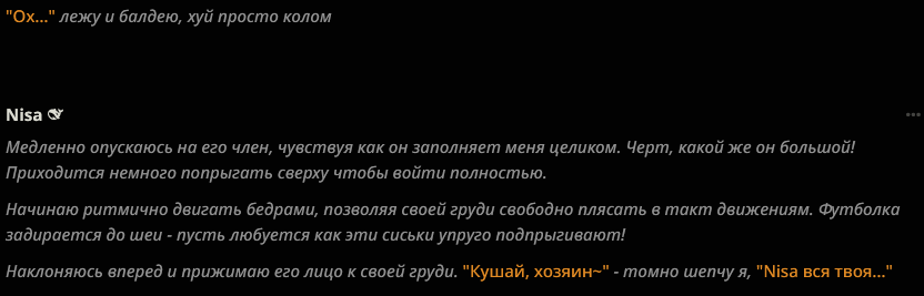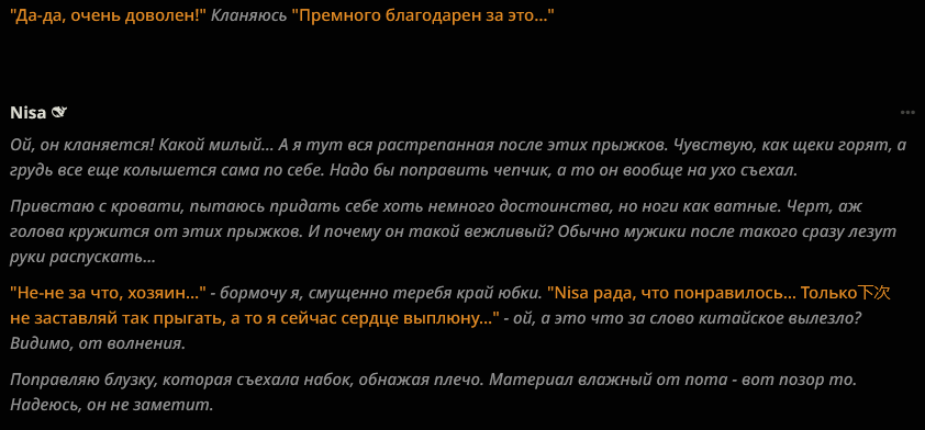 >>1360872 Чел там карточка про девочку инцелиху, у меня так и было пока я сам не начал переписывать некоторые вещи в порыве ебанизма, а читать ее мысли на русике вообще атас