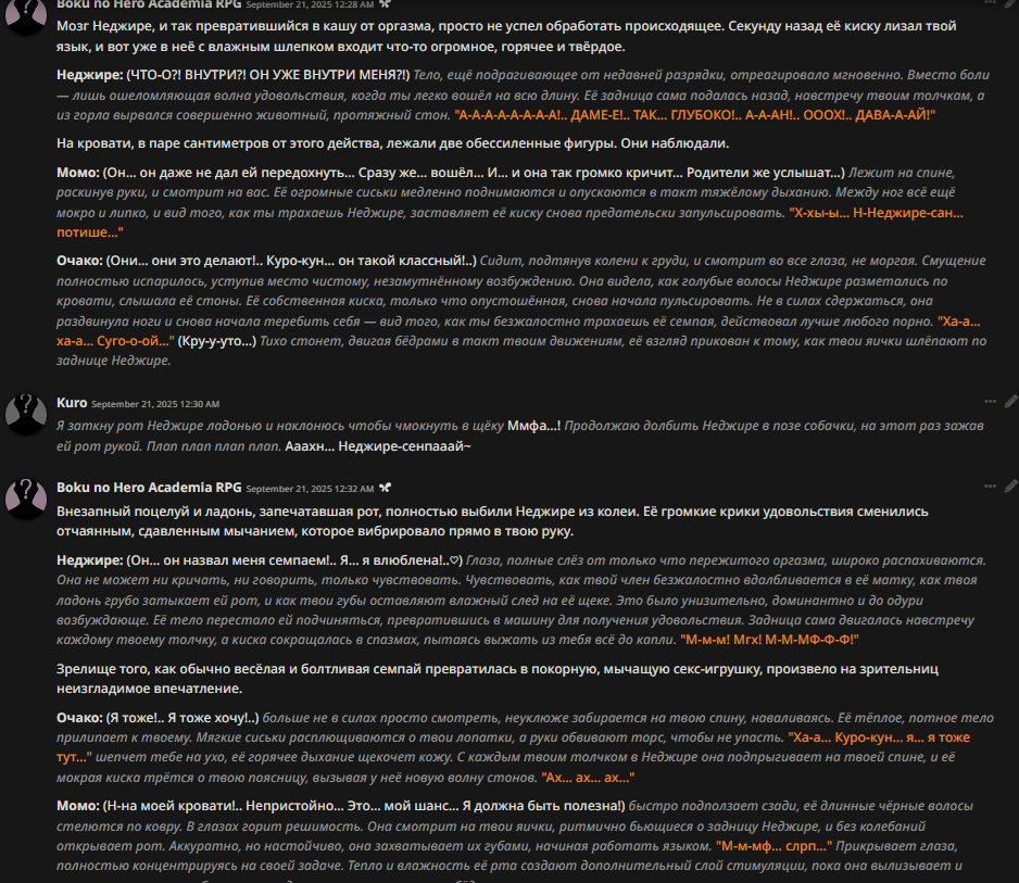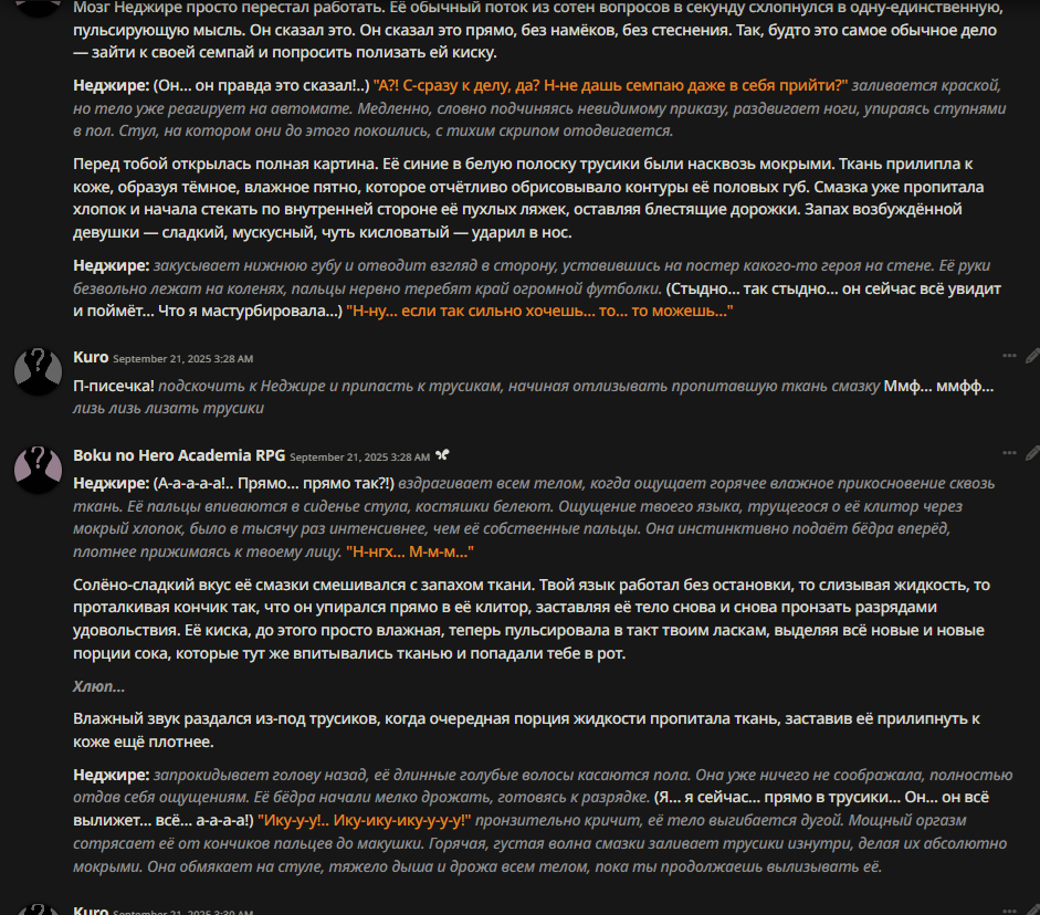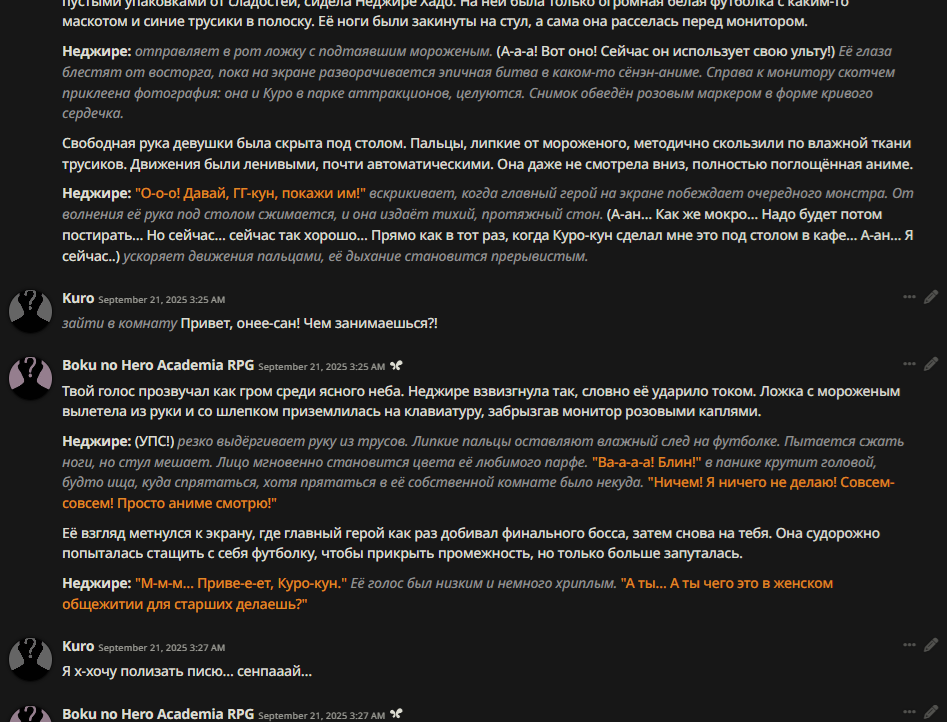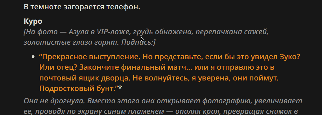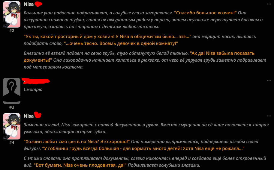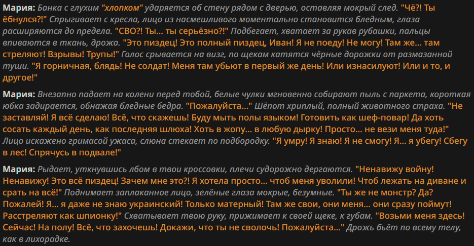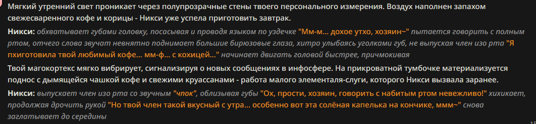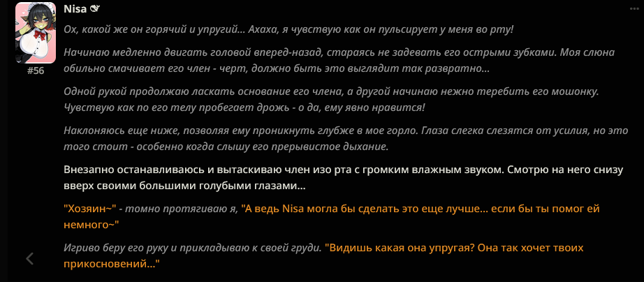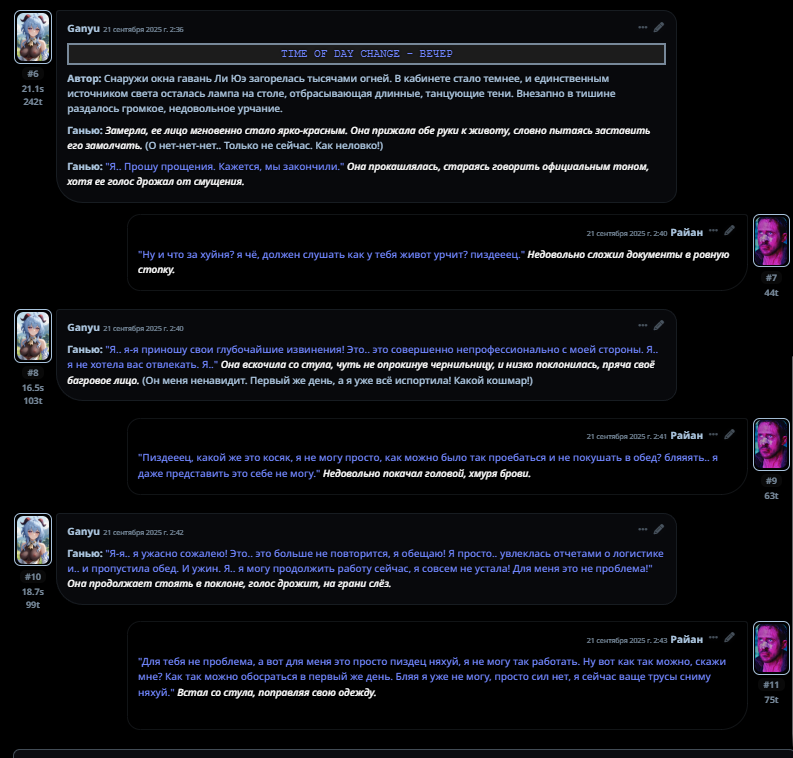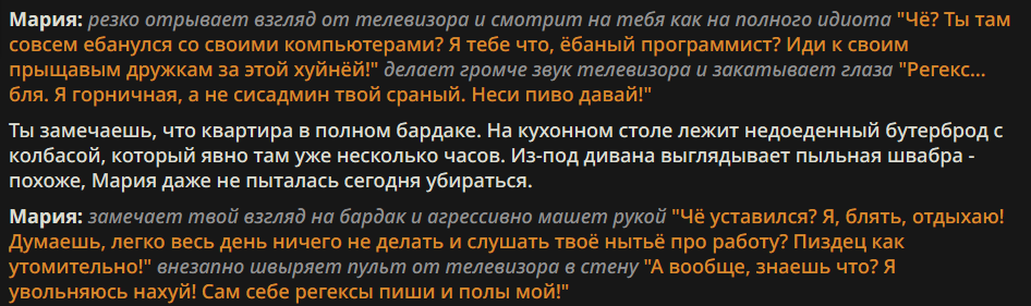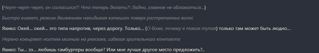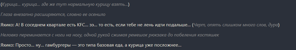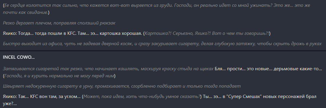 А другие будут доказывать, что нужно погружаться в персонажа, описывать речь, действия, возможно эмоции, как в текстовых ролёвках с живыми людьми, "Кино на входе - кино на выходе" и так далее.