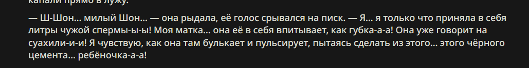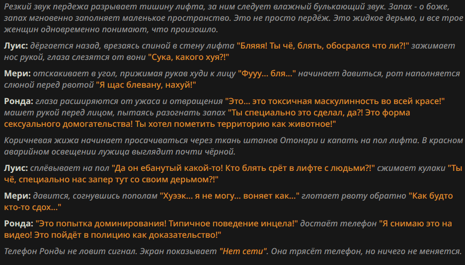 >>1359411 мой мозг отказывается читать такие параграфы, мне тяжело даже их читать, все плывет нахуй в голове, потому что у меня психологическая травма от них. обычно это значит что сетка уходит в лупнум не зная что делать дальше и начинает абстракцию от рп и бесконечно добавление деталей.
