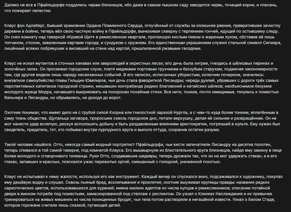 Блять, я заебался, но заставил таки гоймини писать, конечно, еще не хорошо на мой изысканный вкус, но достойно. Хотя, наверное, чуть более многословно, чем хотелось бы. Но я тот еще любитель полотен текста, так что удовлетворён.