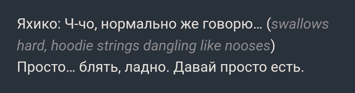 >>1359504 о боже... о боже нет... я не верю что это действительно читают геминиклопчики, только не говорите еще что подобное надо пробивать пробелами, пиздец... нет... я чувствую себя в окружении нормисов и яойщиц которые отыгрывают только драму с подробнейшим описанием чувств и переживаний... сука нет...
