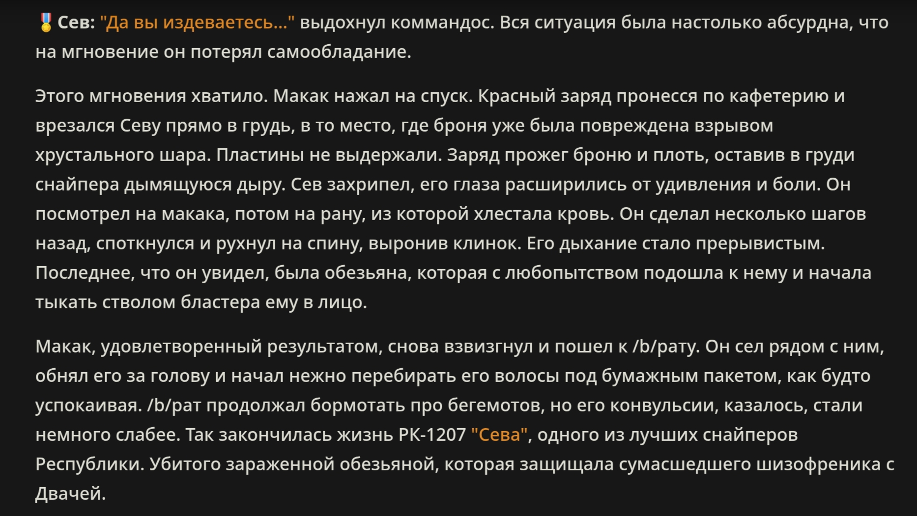 все сетки выше что я описал, смогли в таких условиях идеально придумать свой сценарий, и завершить его. опус к примеру, без лупов, без закруглений, после убийства моей персоны спокойно проиграл сам с собой 80к токенов, придумав своей сценарий в рамках карточки, логически его закончив тем, что последний человек на земле застрелился в бункере. и это без префиллов на продолжение истории и другой хуйни.