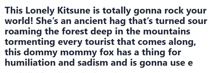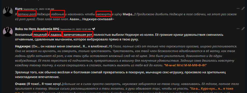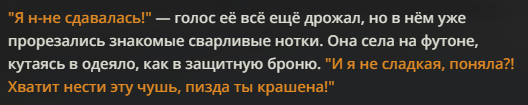 >>1360580 Все понимают что у примеров тоже есть свои проблемы, но без них у тебя будет куда большая проблема - будешь жрать полный слоп вместо задуманной речи персонажа. Ты как любитель низкосортных мамочек наверное привык к такому, но другие - нет.